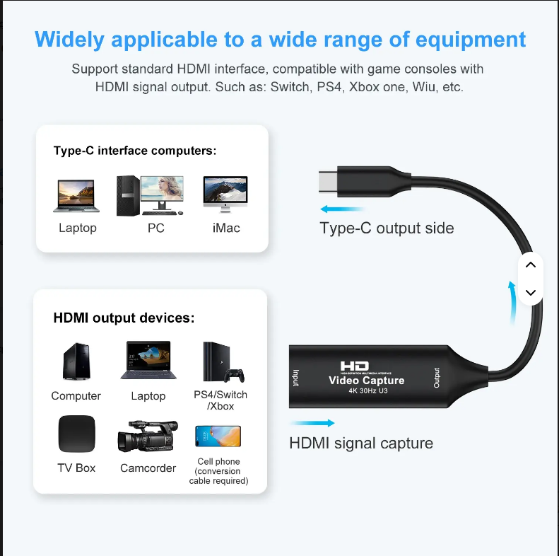 Carte de capture vidéo USB 2.0 USB 3.0 Type C 4K 30Hz HDTV Gris MacBook PC Jeu pour enregistrement de caméra DVD Boîte audio et vidéo