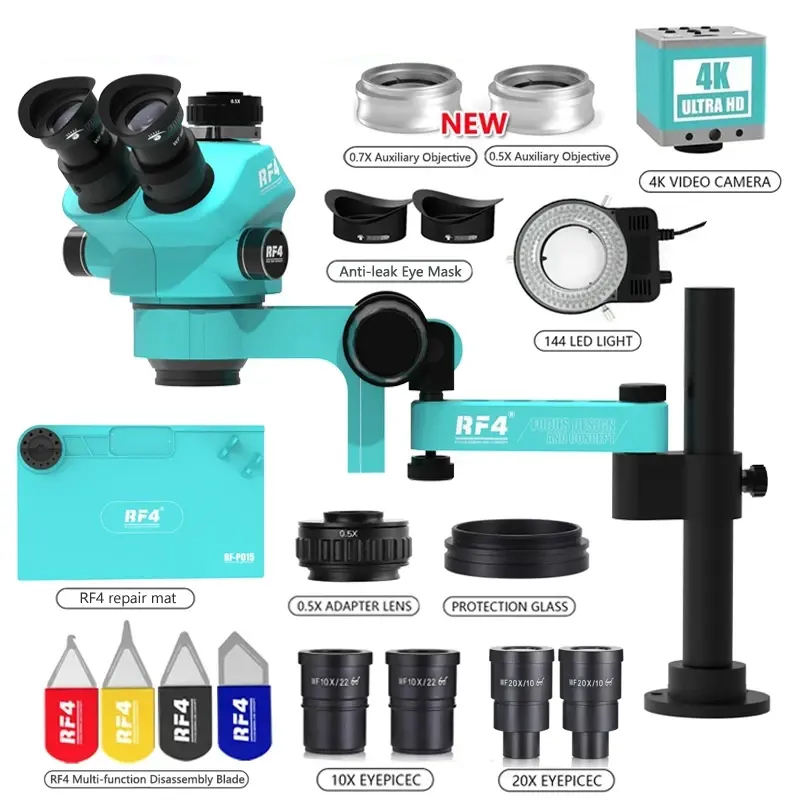 Ensemble Microscope Stéréo Trinocular RF4 avec Caméra 4K, Support à Bras Articulé à Rotation 360°, pour Soudure de Téléphones et Réparation de Cartes PCB – Modèle RF7050TVPRO-F019