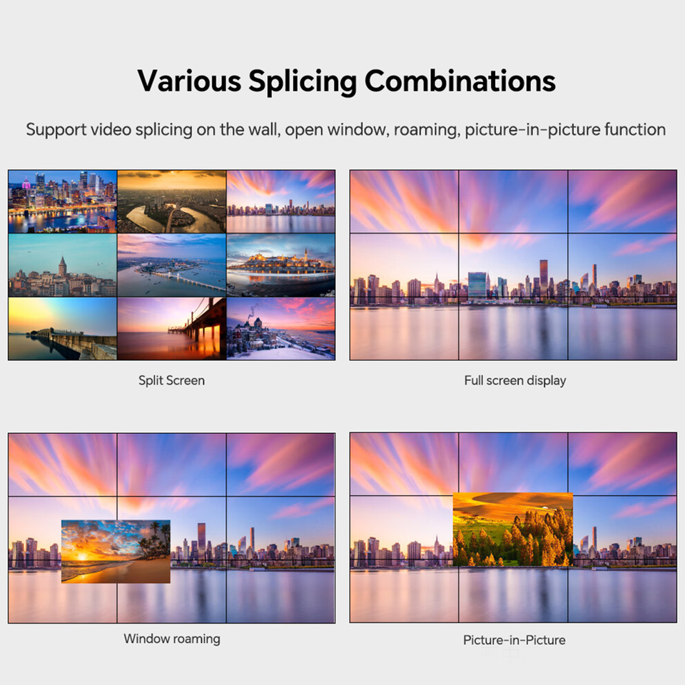 Capacité de la fenêtre:Prise en charge de l'épissage MXN, de l'itinérance des fenêtres multi-écrans, de la superposition, du mode "pip" (Picture-in-Picture).