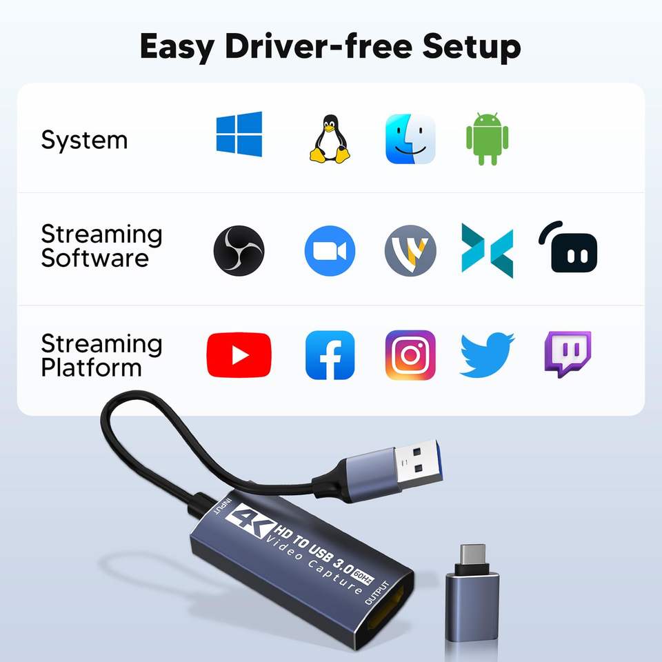 Carte de capture vidéo 4K Capture de jeu pour le streaming, l'enregistrement et la diffusion, 1080p 60fps pour OBS, PS5, Xbox, PC, Mac, Switch