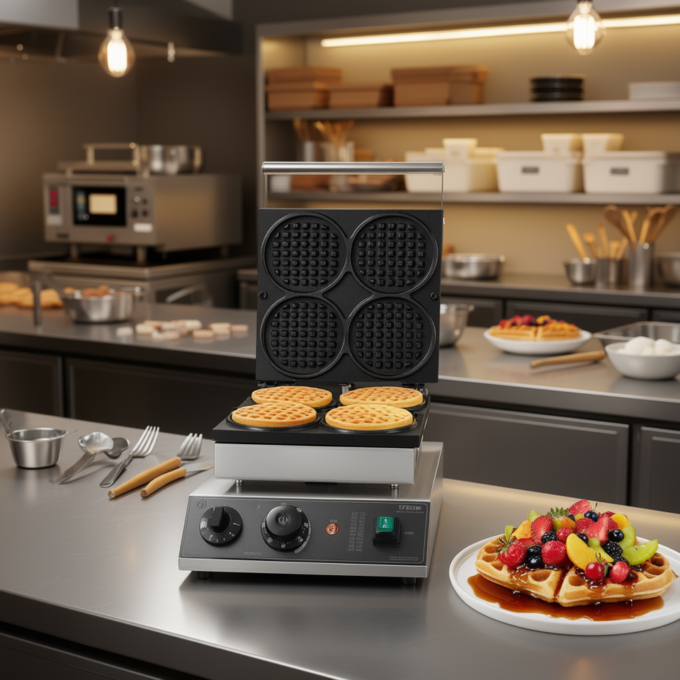Gaufrier rond à 4 trous 1750W, antiadhésif, équipement de boulangerie professionnel pour la préparation de gaufres