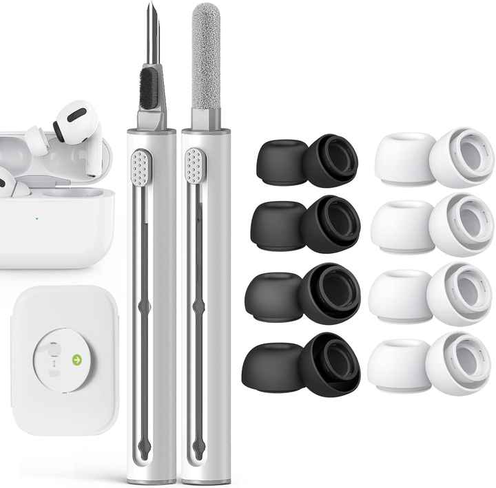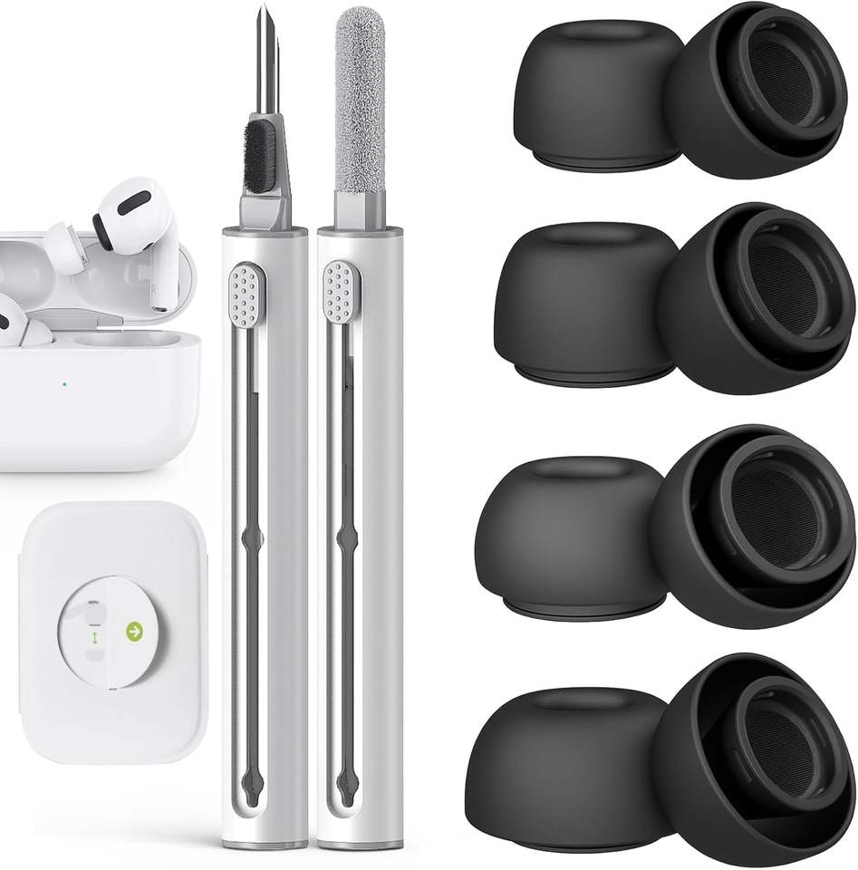 4 paires d'embouts d'oreille en silicone de remplacement pour AirPods Pro avec trous de réduction du bruit, boîte d'emballage, stylo de nettoyage, XS/S/M/L, blanc et noir