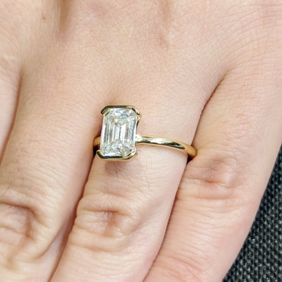 Bague avec diamant de laboratoire taille émeraude, serti en partie sur une lunette.