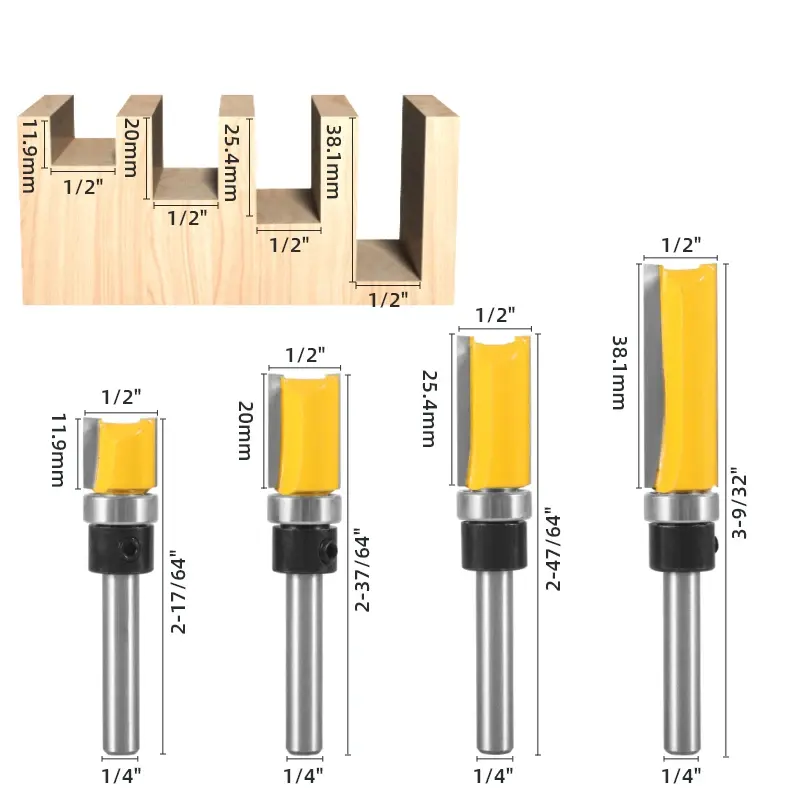4 embouts de routeur à motif de garniture affleurante de 1/4 \ "de diamètre 1/2 \" embouts de modèle de roulement inférieur CNC fraise à rainurer pour bois 8mm boîte