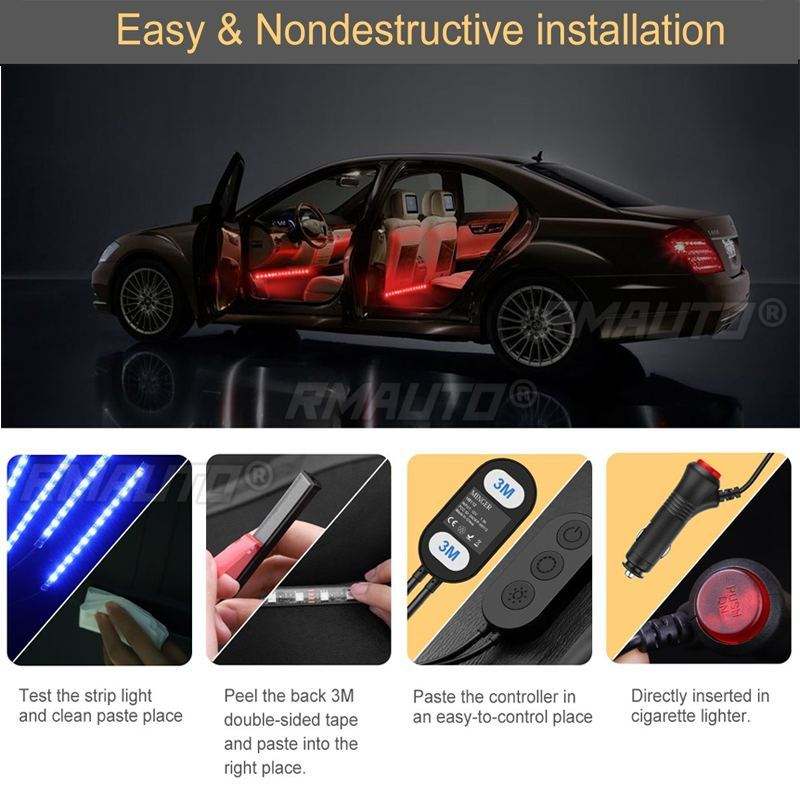 Lot de 4 Lumières LED d'Ambiance Multicolores 4-en-1 pour Voiture, Bandes Lumineuses pour Tableau de Bord et Plancher, Lampe Décorative pour Allume-Cigare