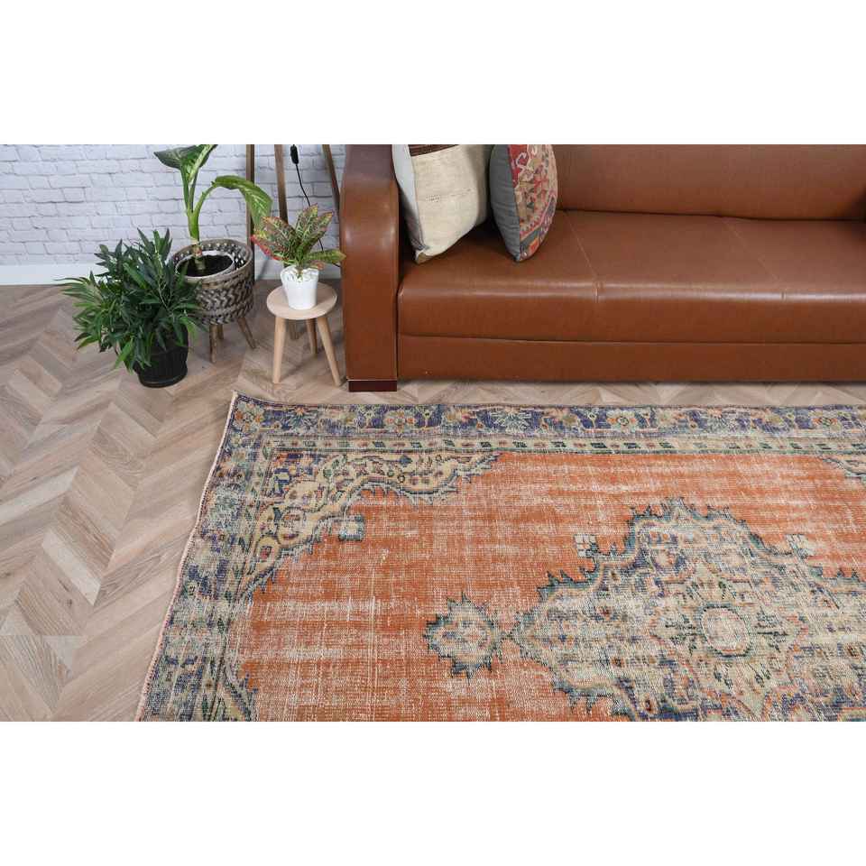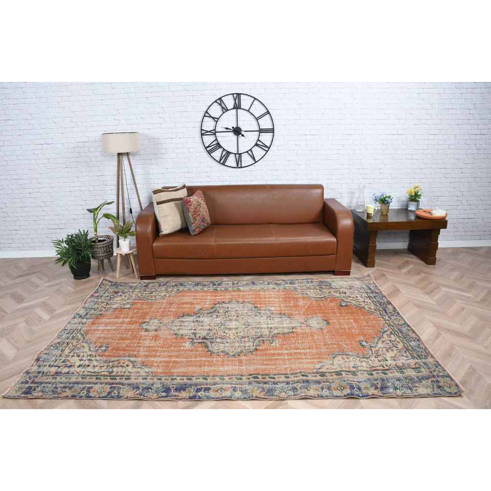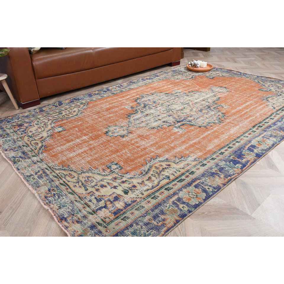 Tapis vintage 5,2 x 8,2 pieds, grand tapis turc, tapis oriental en laine orange et bleu