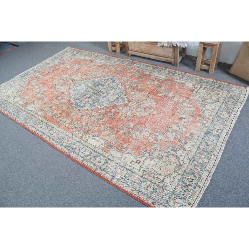 Tapis turc vintage 5,3x9 pieds, grand tapis, tapis en laine camouflage orange et bleu
