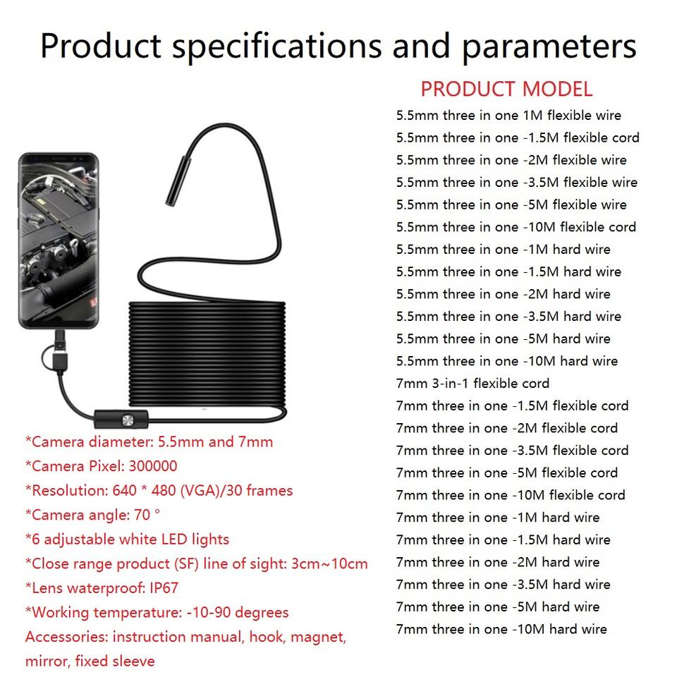 5.5/7mm Three in One Industrial Endoscope Pipeline, Automotive air Conditioning Engine Testing, Mobile Phone Endoscope
