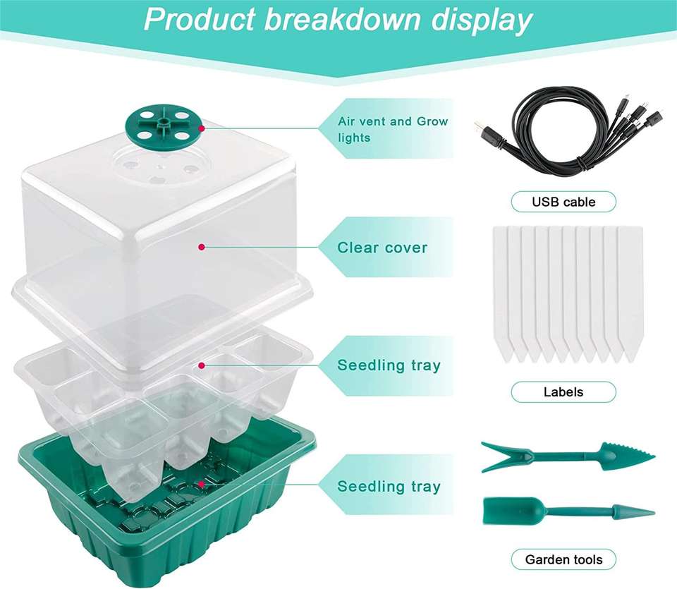Chaque ensemble de produits comprend: (5 plateaux à graines + 5 couvercles supérieurs transparents + 5 plateaux à base d'eau + 5 étiquettes de plantation + 5 lumières LED circulaires + 1 une remorque cinq câbles de données USB + 2 outils de jardinage)