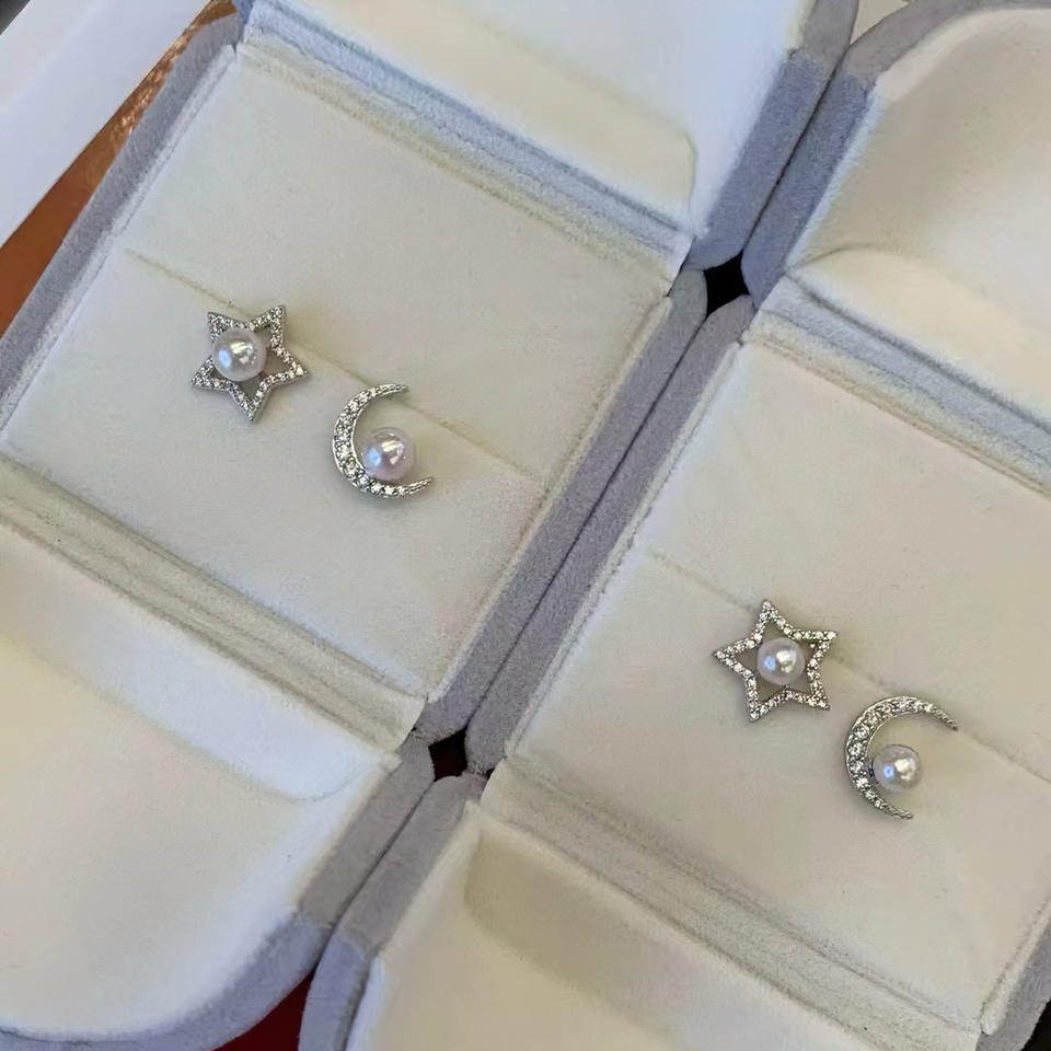 5-6mm Zhuji Natural Freshwater Pearl AB Type Asymmetric Earrings S925 Silver Sun Moon Star Design Fresh and Elegant Look