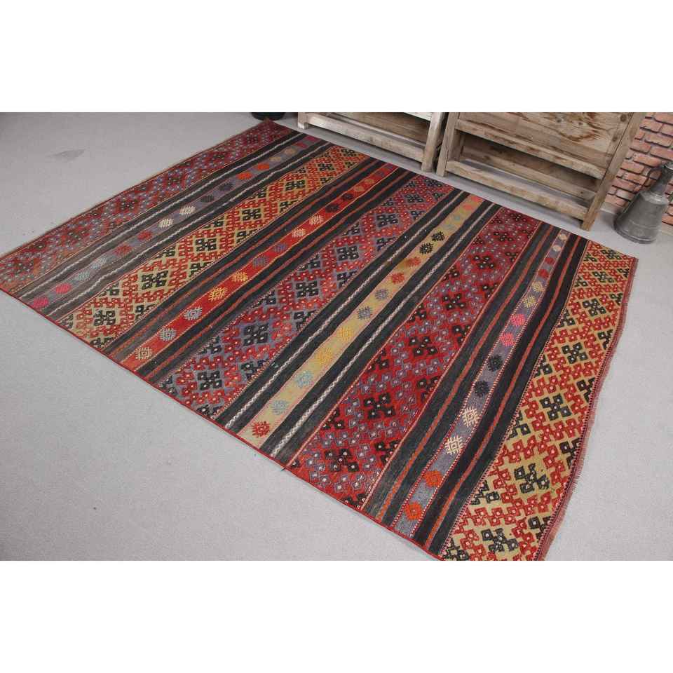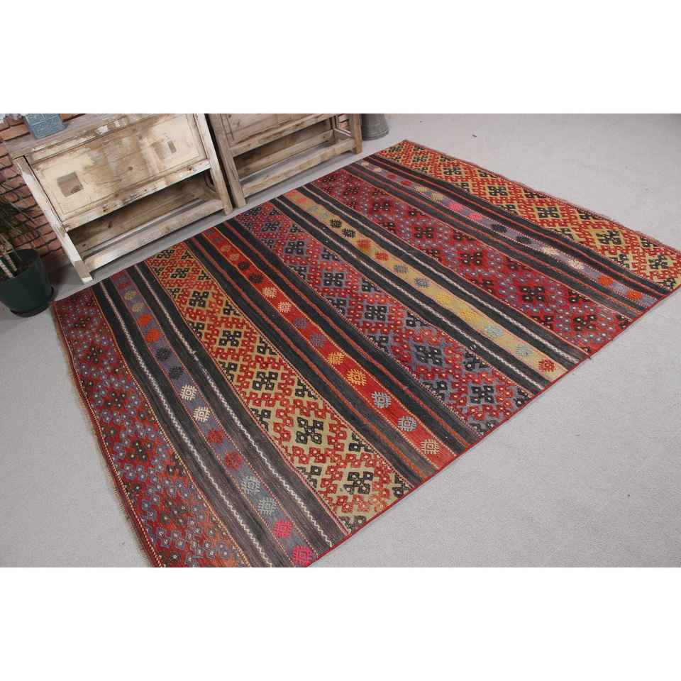 Tapis turc 5,6 x 6,7 pieds, tapis vintage, tapis en laine rouge et noir à motifs floraux