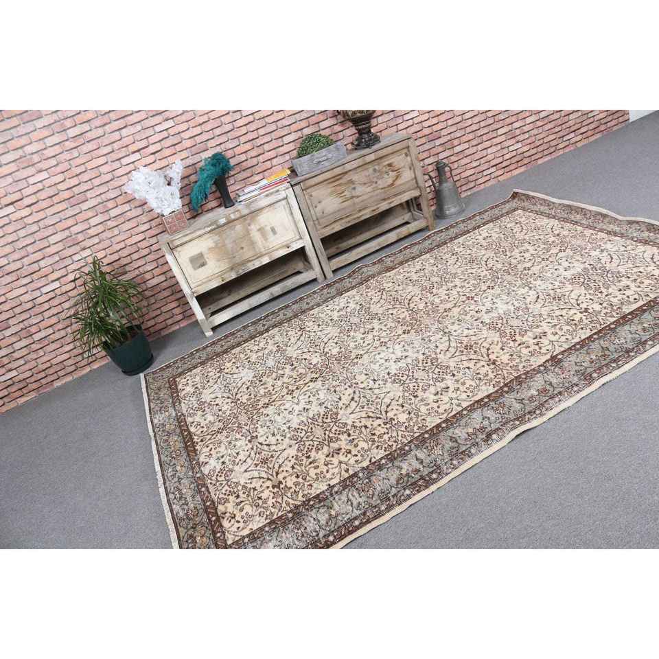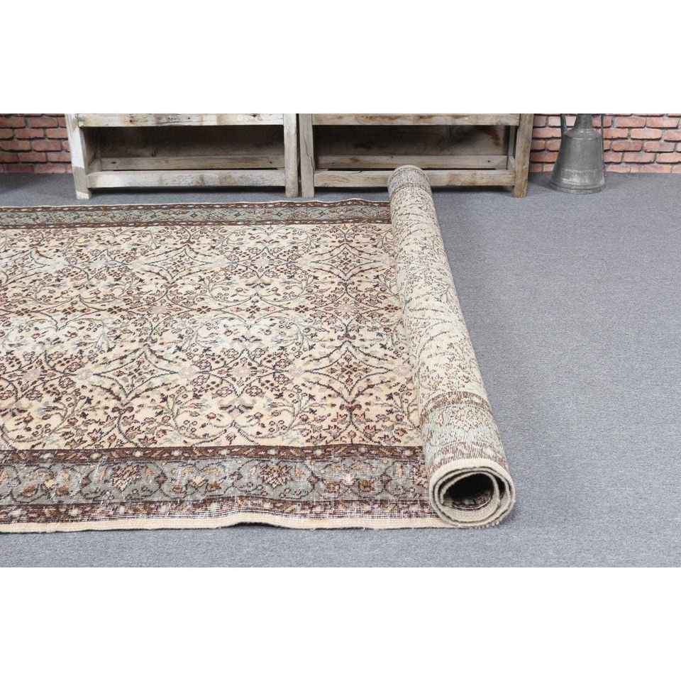 5.8x8.5 ft Vintage Rug, Turkish Large Rug, Brown Gray Bordered Wool Rug