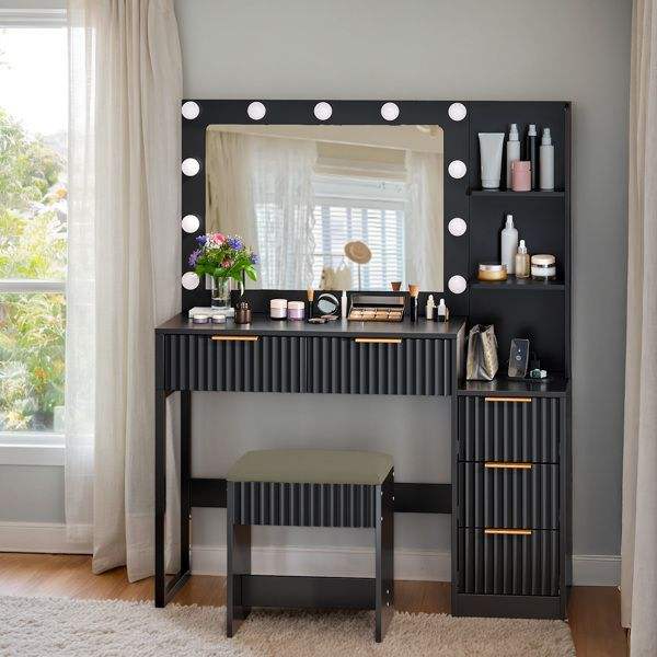 Ensemble coiffeuse 5 tiroirs et 2 étagères, finition mélaminée, en panneau de particules noir, avec 11 ampoules tricolores et multiprise, pour coiffeuses de maquillage