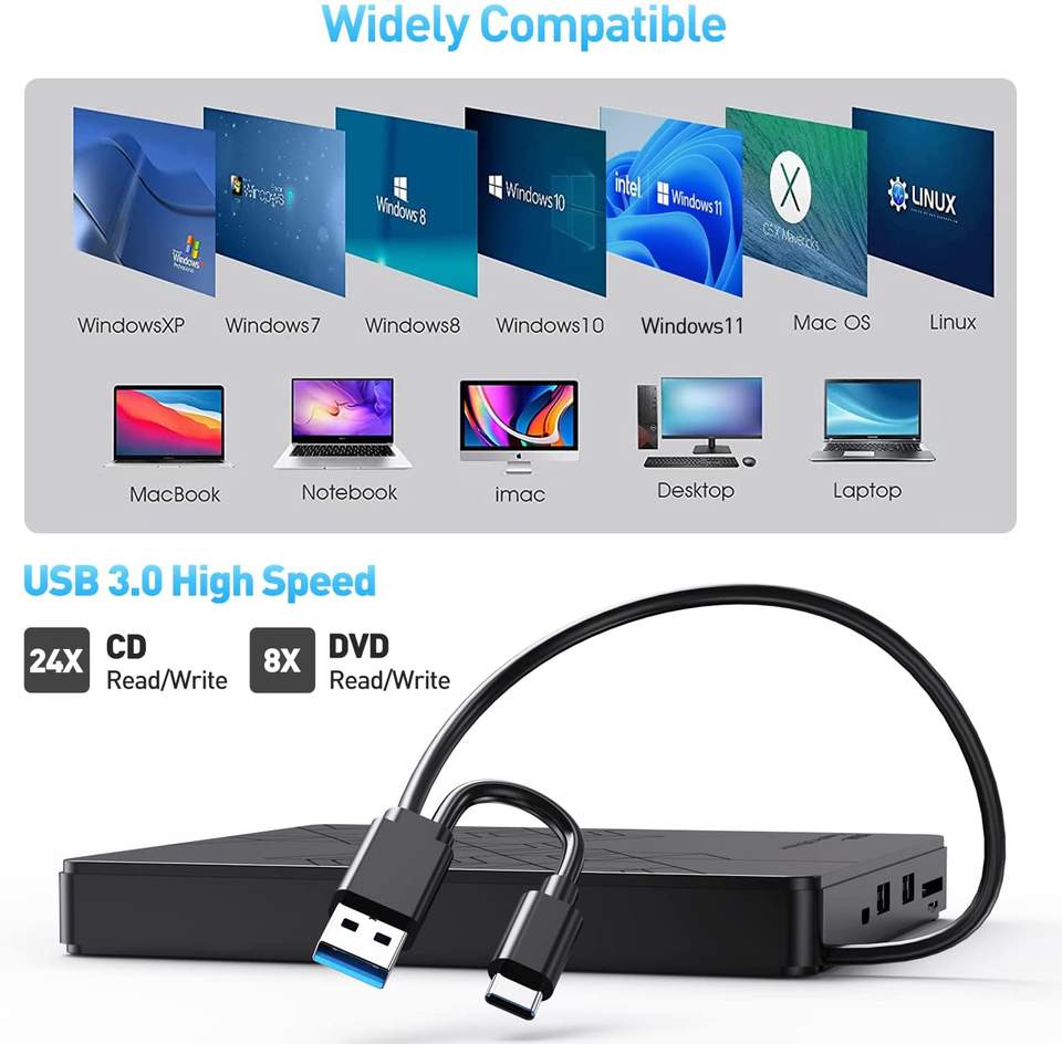 Lecteur Blu-ray externe 5 en 1 USB 3.0 Type-C, lecteur de disques Blu-ray 3D, lecteur/graveur de DVD/BD, lecteur Blu-ray portable