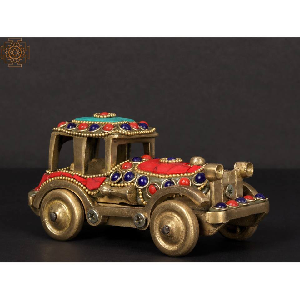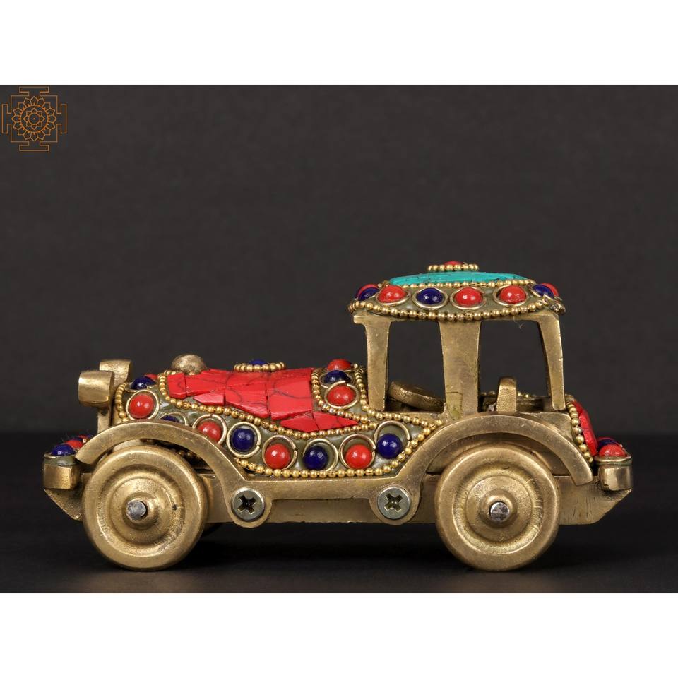 Pièce maîtresse de voiture classique en laiton faite à la main de 5 pouces avec incrustation complexe pour la décoration intérieure et les cadeaux fabriqués en Inde