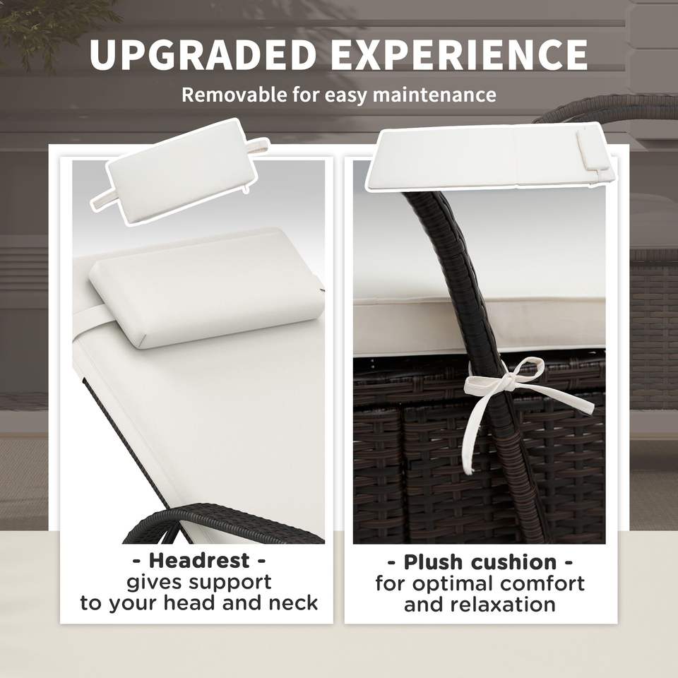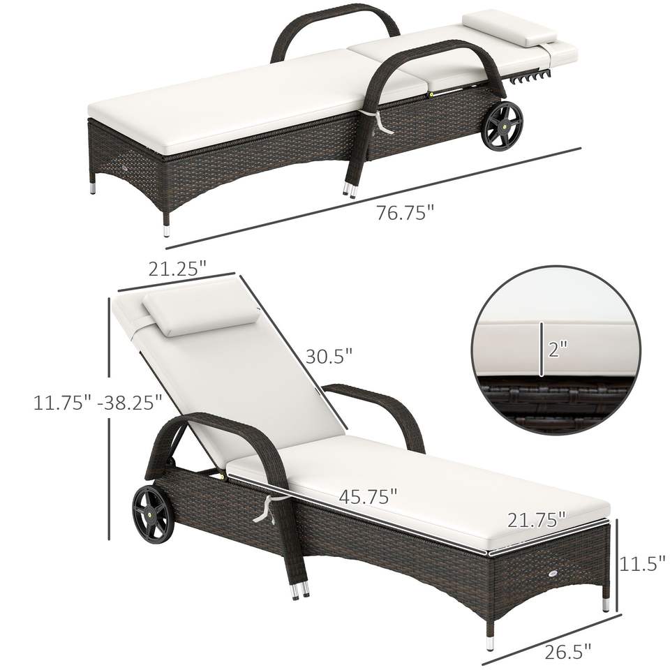 Chaise longue d'extérieur à dossier réglable sur 5 niveaux, en rotin crème, avec roulettes et coussin pour bronzer