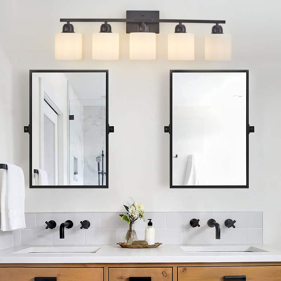 Appliques murales modernes pour salle de bain à 5 lumières, en noir, avec abat-jour en verre givré blanc laiteux, douille E26 (ampoules non incluses)