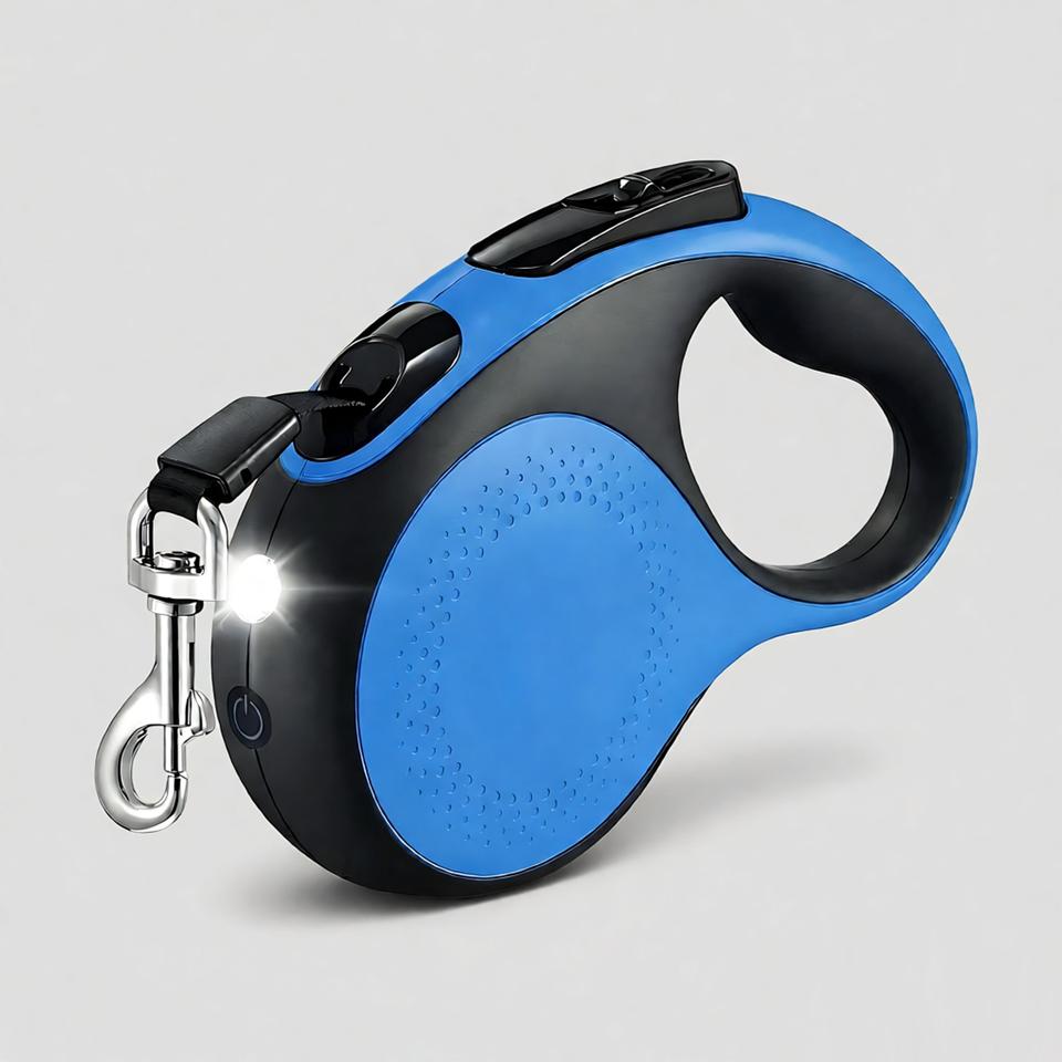 Laisse Rétractable de Luxe Personnalisée pour Chien, 5 Mètres, Bleu/Noir Uni, avec Lumière LED, Dégagement Rapide, Distributeur de Sacs à Crottes, 30kg, Écologique