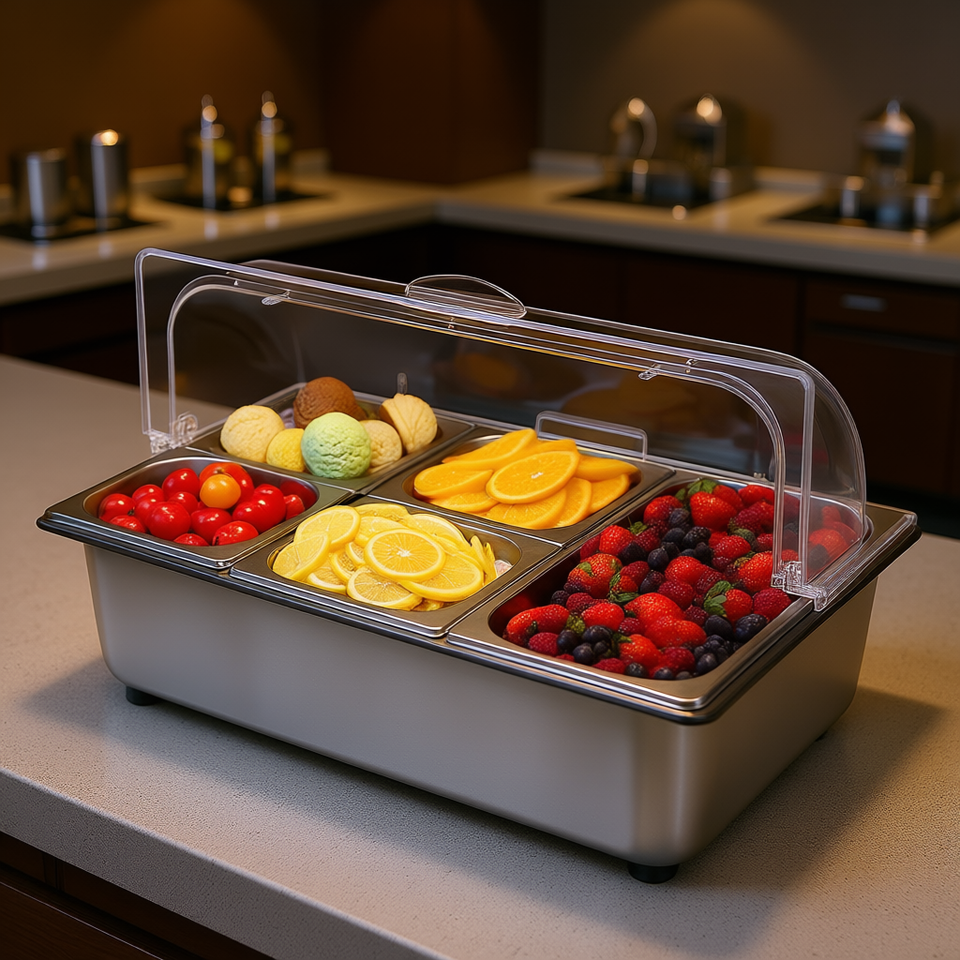 Conteneur de service alimentaire de comptoir à 5 compartiments avec couvercle en acier inoxydable poli miroir pour restaurant, hôtel, condiments