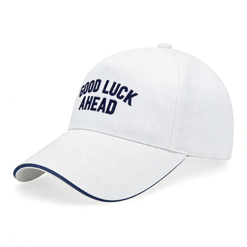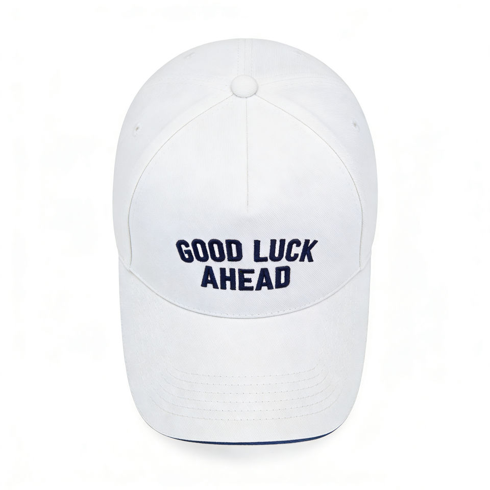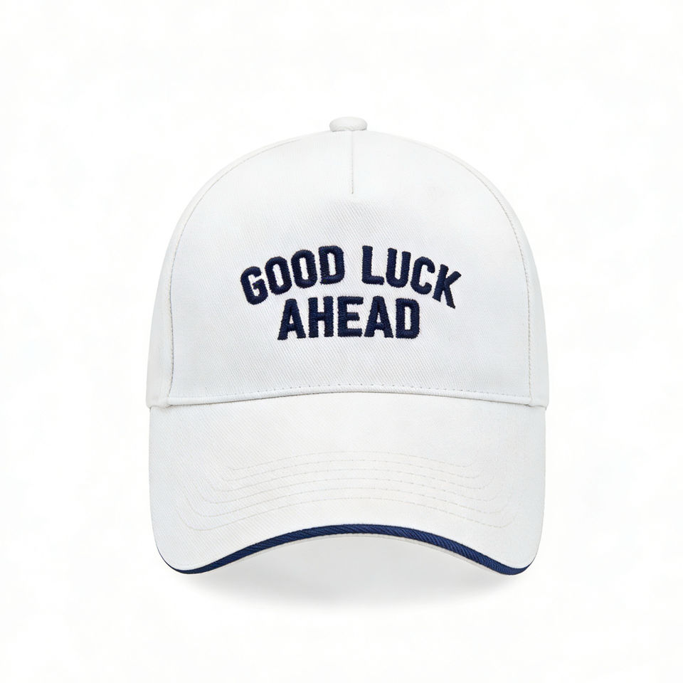 Casquette de baseball 5 panneaux INJAE VINA brodée 'Good Luck Ahead' blanche, décontractée, sportive, en toile de coton, unisexe, réglable, protection solaire