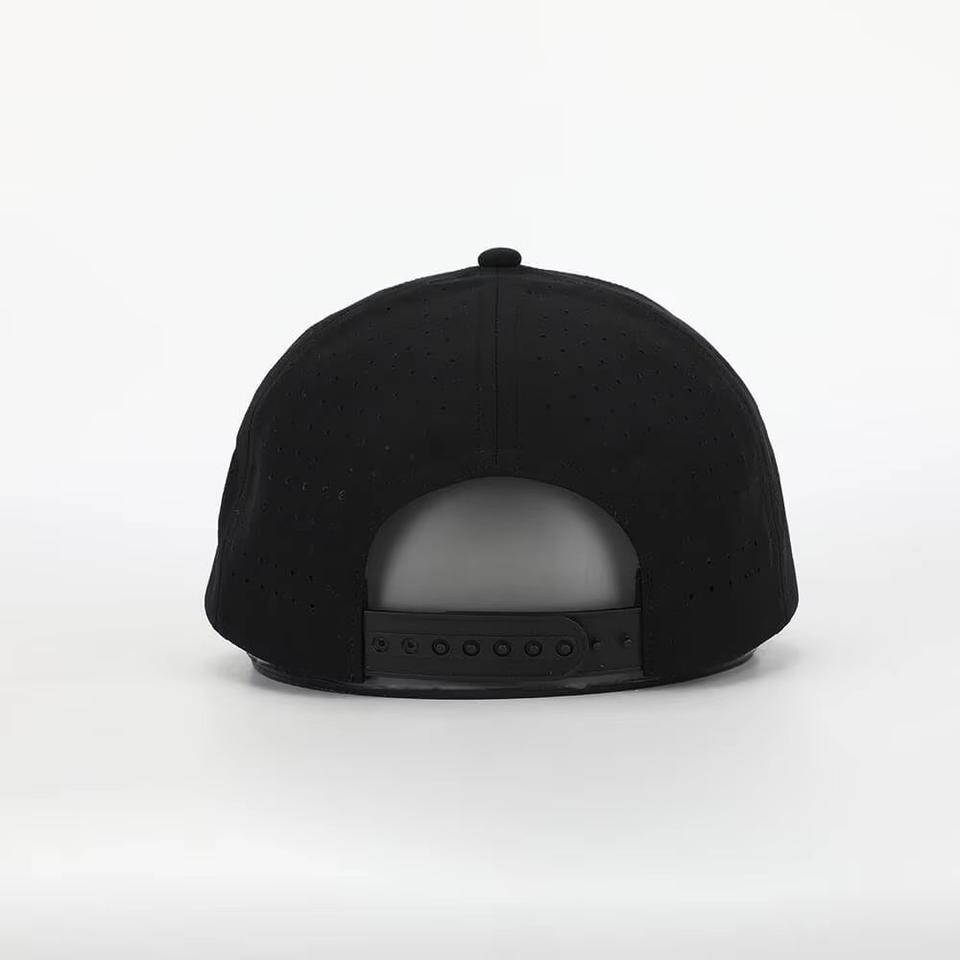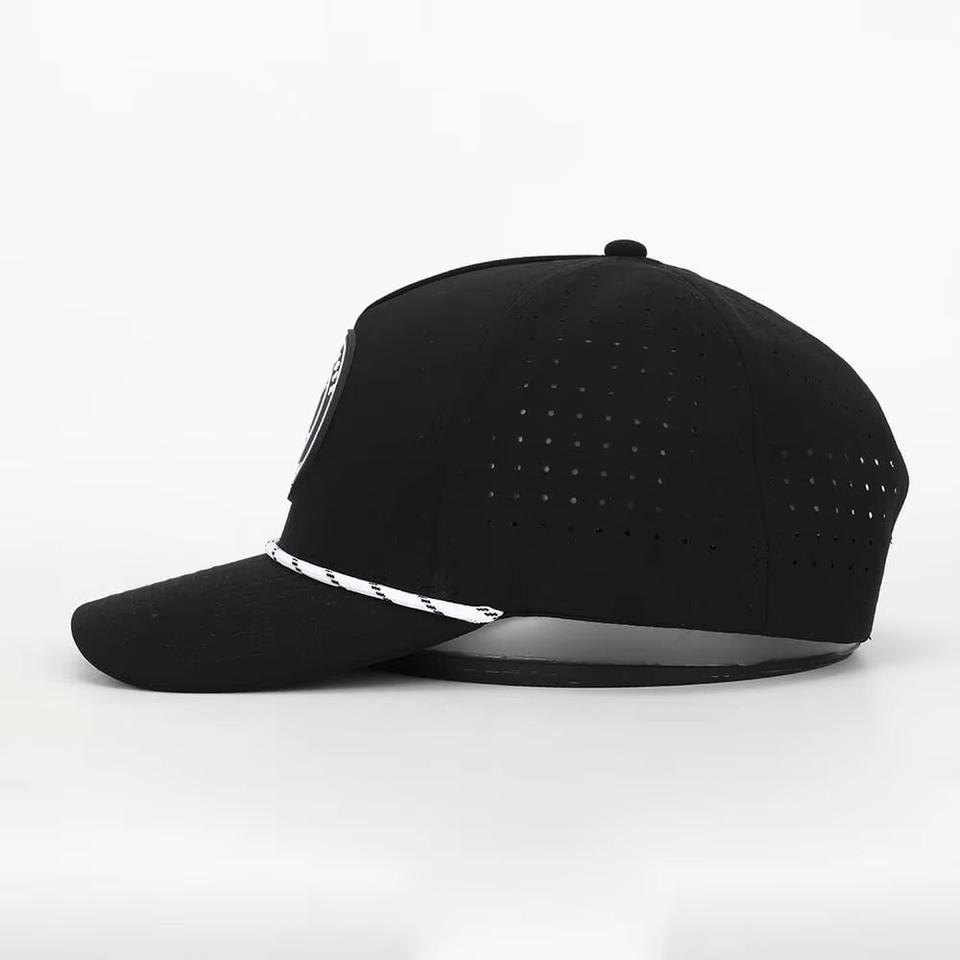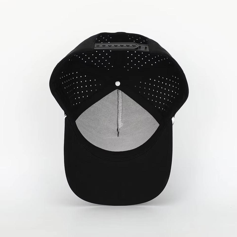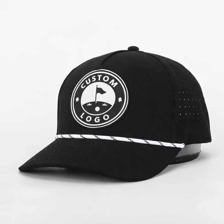 Casquettes de baseball 5 panneaux perforées avec patchs PVC personnalisés, logo, chapeau de golf avec cordon pour homme et femme, fabriquées au Vietnam.
