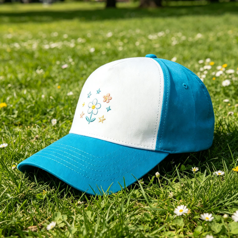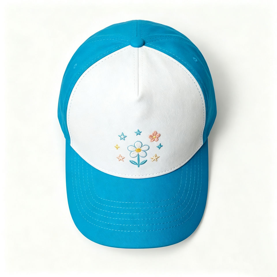 Casquette de baseball à 5 panneaux avec broderie florale, bleu et blanc, réglable, légère et respirante, idéale pour le golf et la randonnée en extérieur