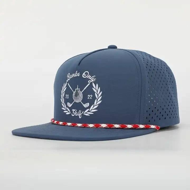 Chapeau de golf de sport en polyester imperméable à 5 panneaux avec logo brodé découpé au laser perforé à bord plat papa Gorras casquette Snapback