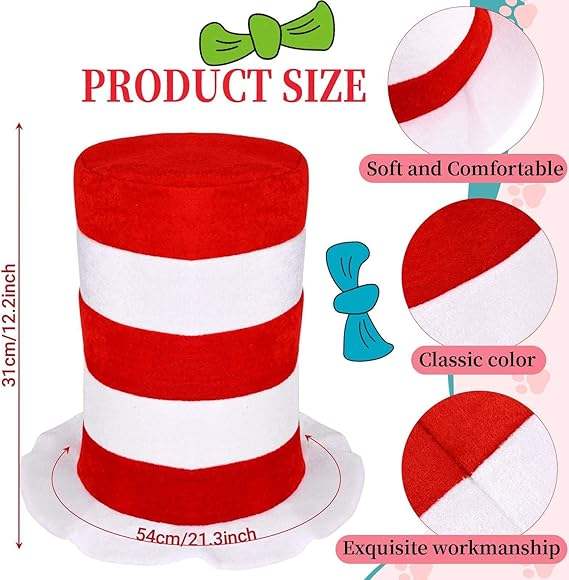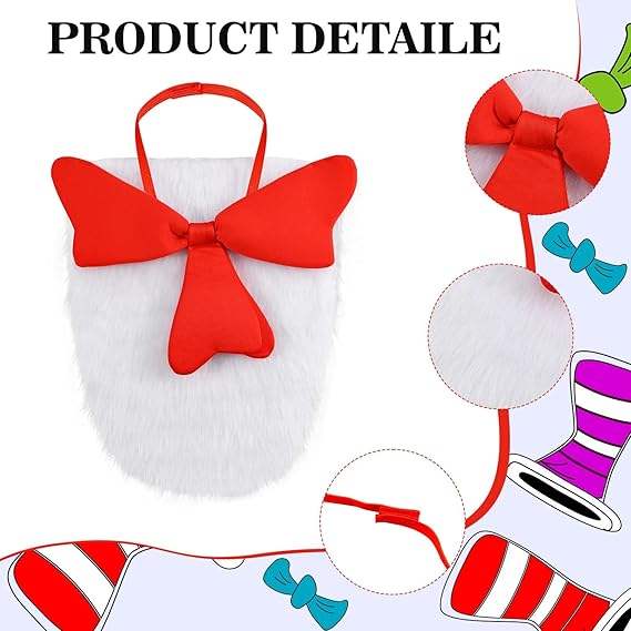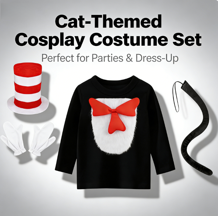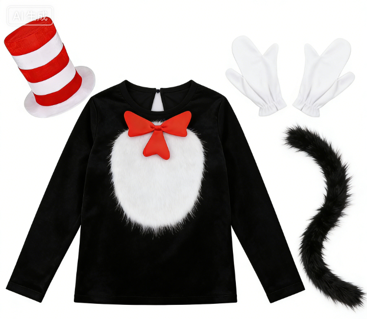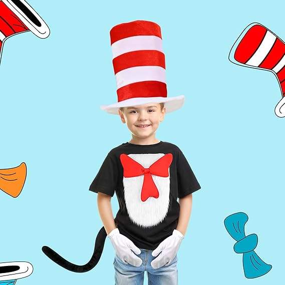 Costume de chat noir 5 pièces comprenant un chapeau haut-de-forme, une chemise, une cravate papillon et une queue en fourrure pour la Journée du livre
