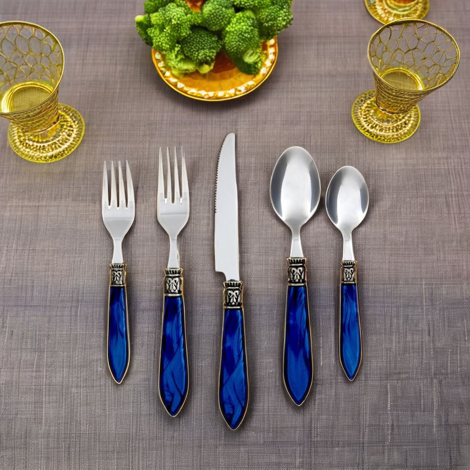 Ensemble de couverts en acier inoxydable de 5 pièces avec poignées enduites bleues modernes au design argenté élégant