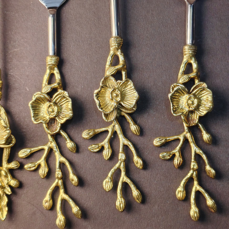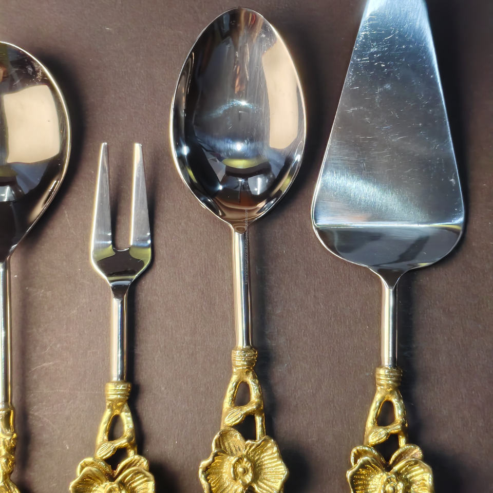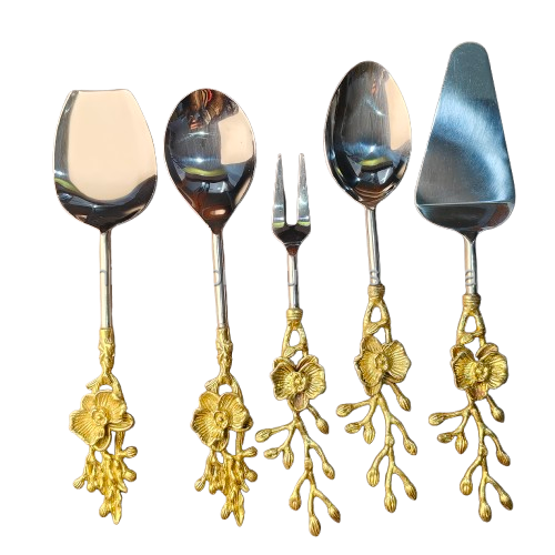 Ensemble de couverts en acier inoxydable et laiton ergonomique à haute arche, résistant à la rouille, écologique et durable, 5 pièces, motif de feuilles de fleurs en relief