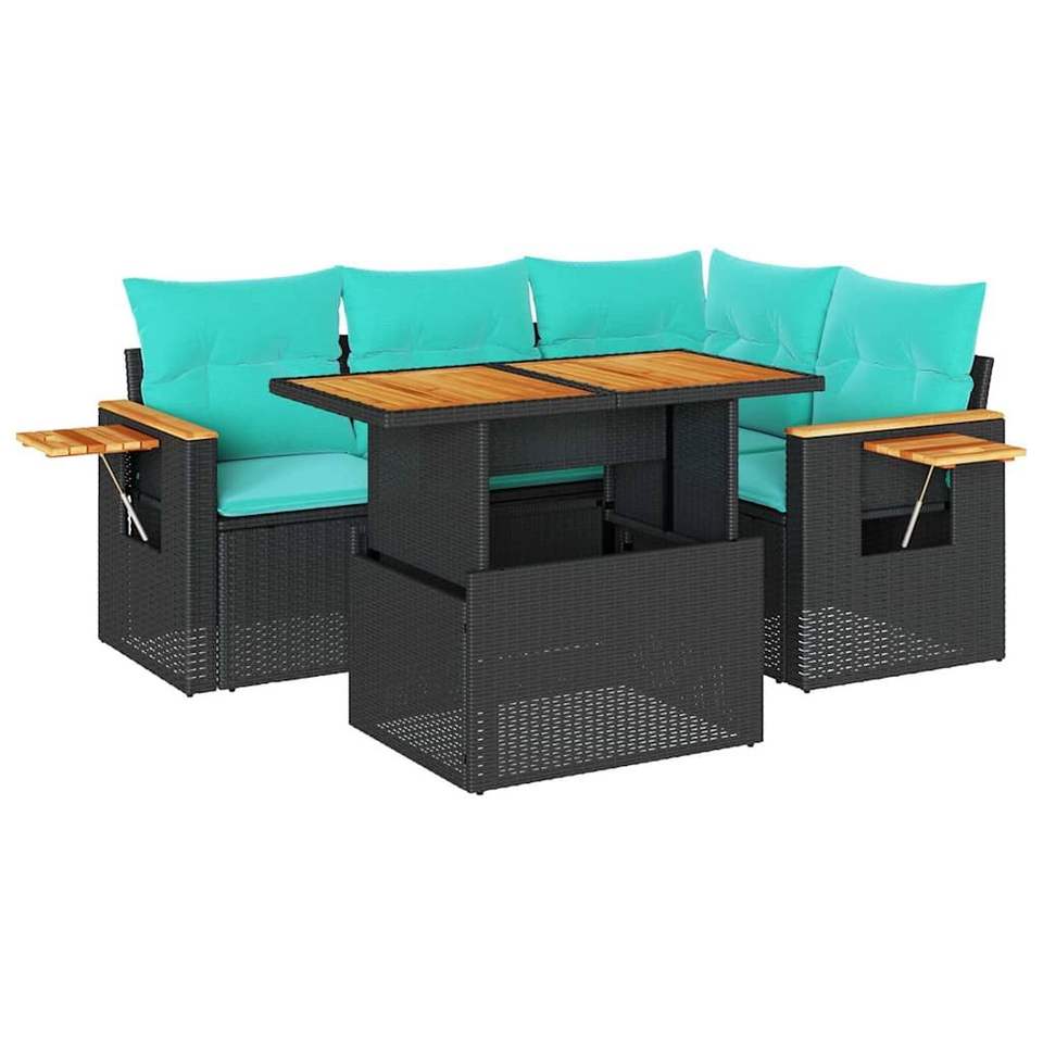 Ensemble de canapé de patio 5 pièces avec coussins Acacia en poly rotin noir