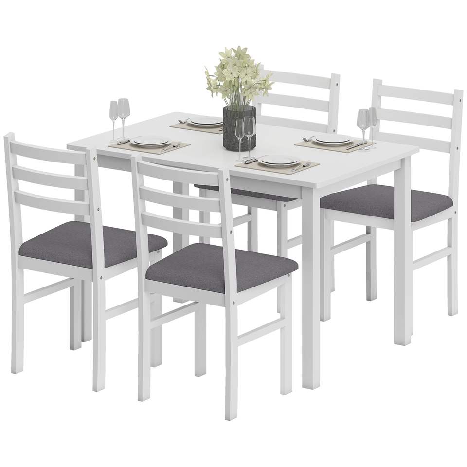 Ensemble de table de cuisine blanche de style farmhouse 5 pièces pour 4 personnes avec chaises rembourrées et pieds en bois de caoutchouc, petit ensemble de salle à manger
