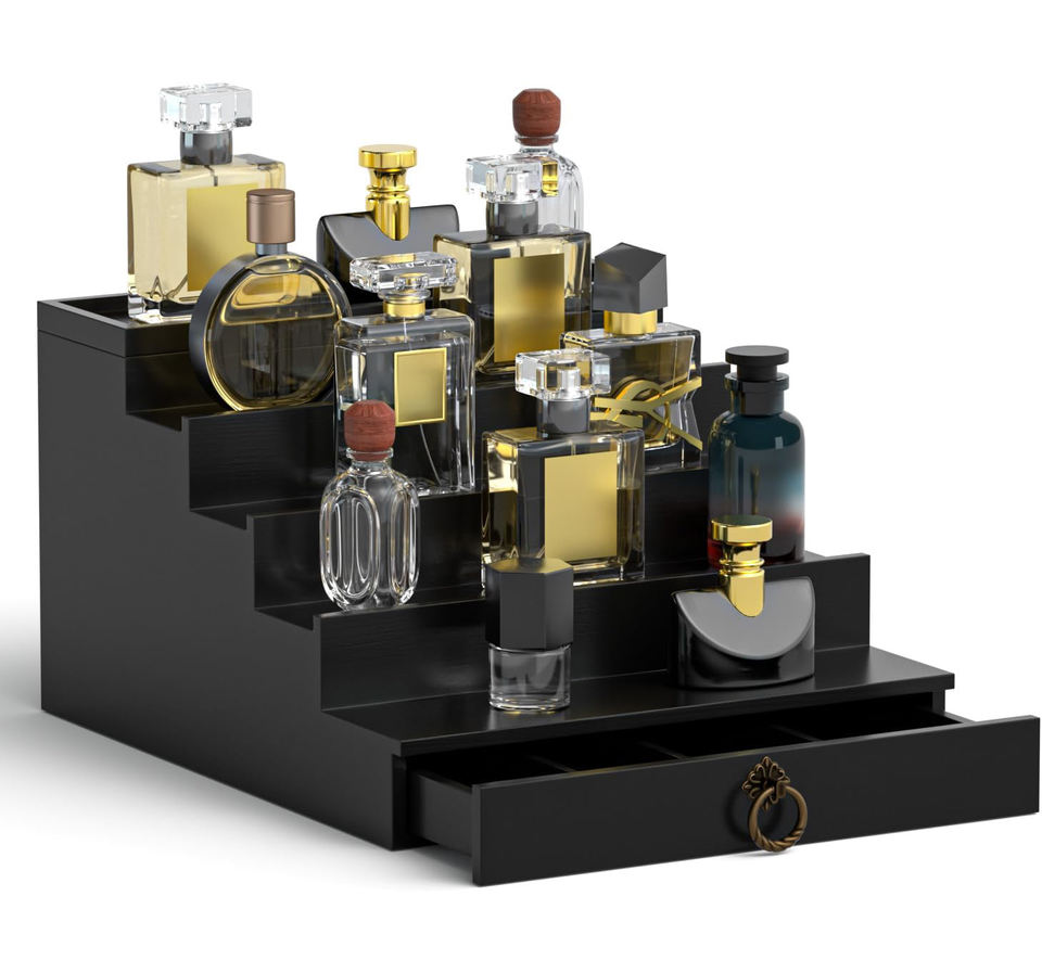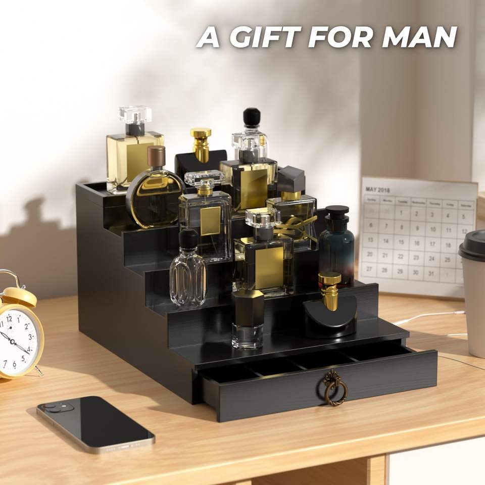 Organisateur de Cologne à 5 niveaux avec tiroir, présentoir et support de rangement en bois noir pour parfums, idée cadeau pour homme