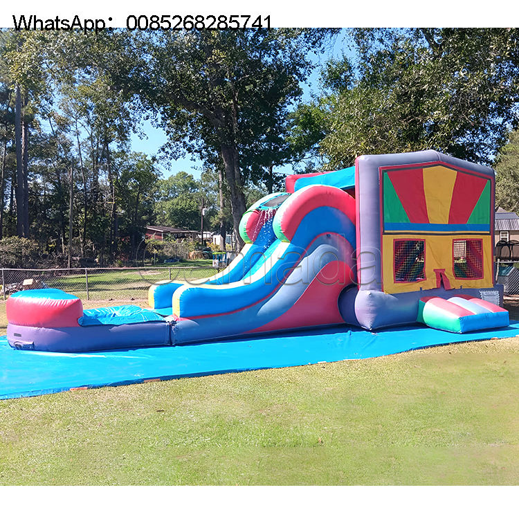 Structure gonflable commerciale 5 en 1 avec toboggan aquatique marbré violet, bleu et gris