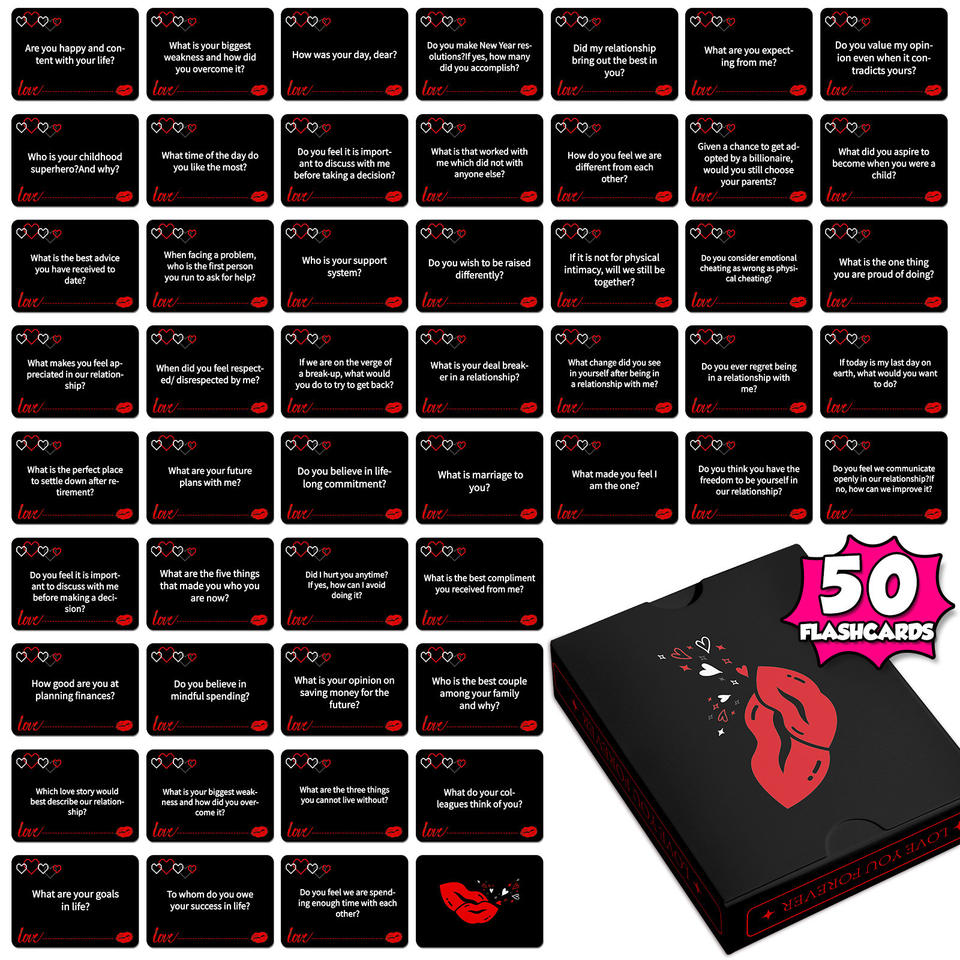 50 cartes d'interaction personnalisées pour couples, petites cartes de questions mutuelles pour un jeu de conversation en boîte en carton coloré
