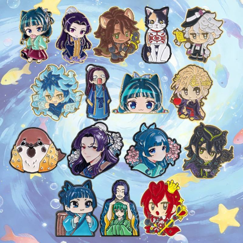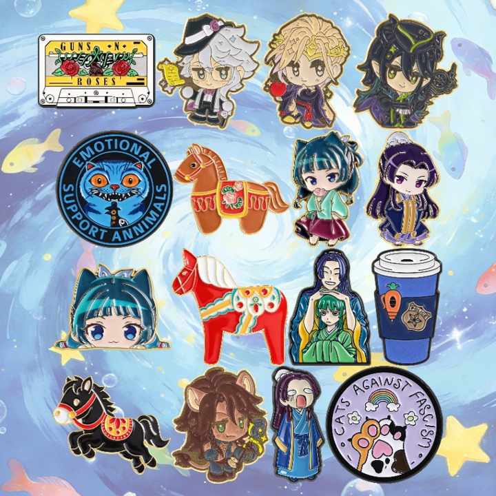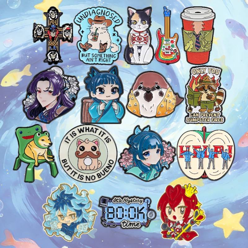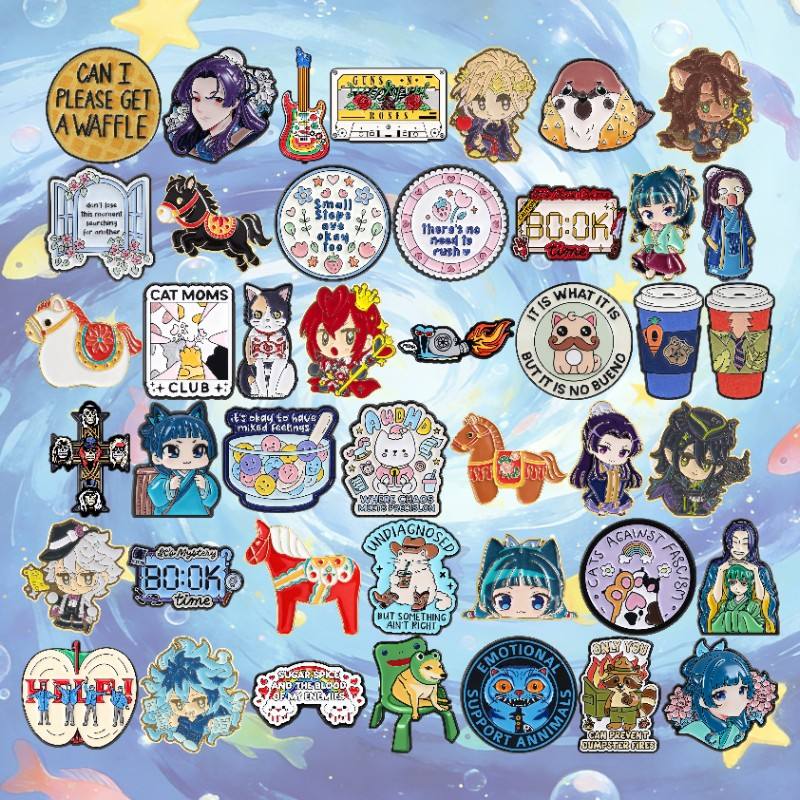 50 modèles de badges en émail 2026, best-sellers, motifs animaux, chat noir, musique, café, logo rond, anime, en stock entrepôt, vente en gros