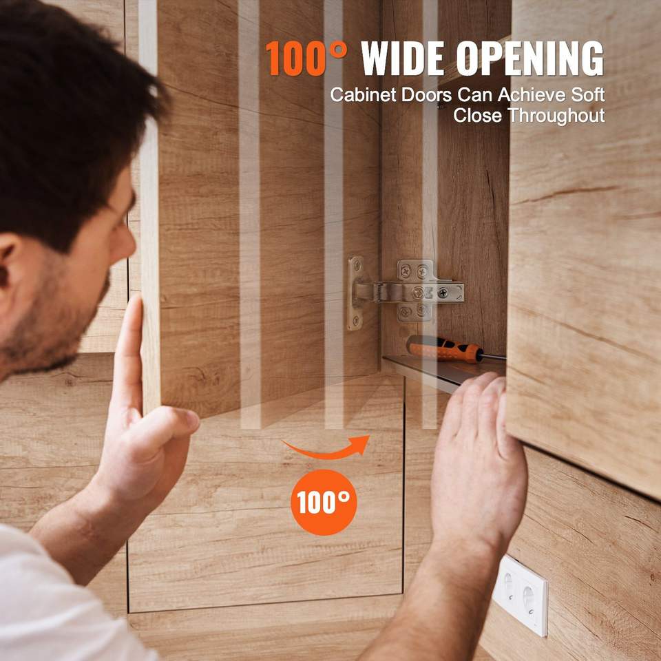 Lot de 50 charnières de porte de placard de cuisine à recouvrement total, ouverture à 100 degrés, fermeture amortie, charnières dissimulées pour meubles