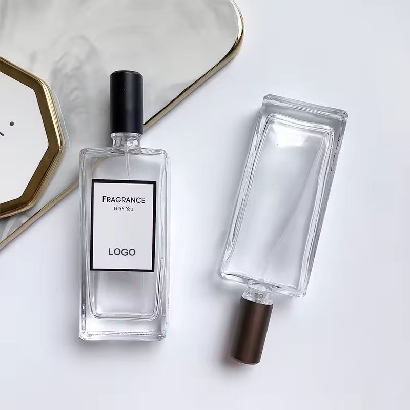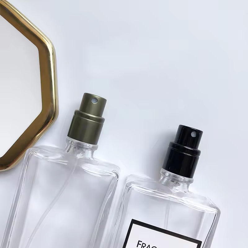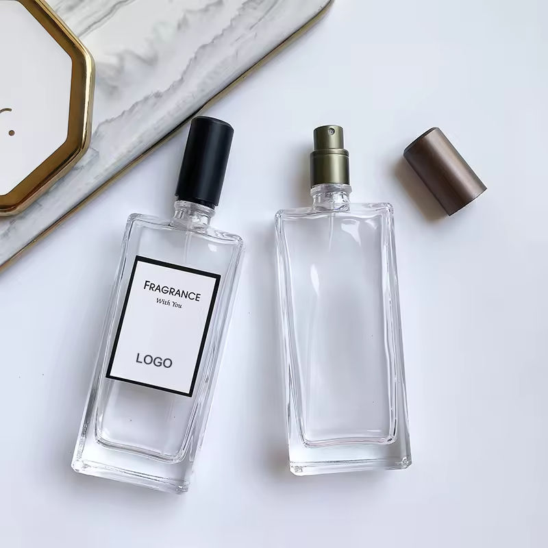 Flacon de parfum en verre portable de 50 ml, carré, imprimé sérigraphié, avec pompe pulvérisatrice, emballage séparé haut de gamme, pour huiles parfumées