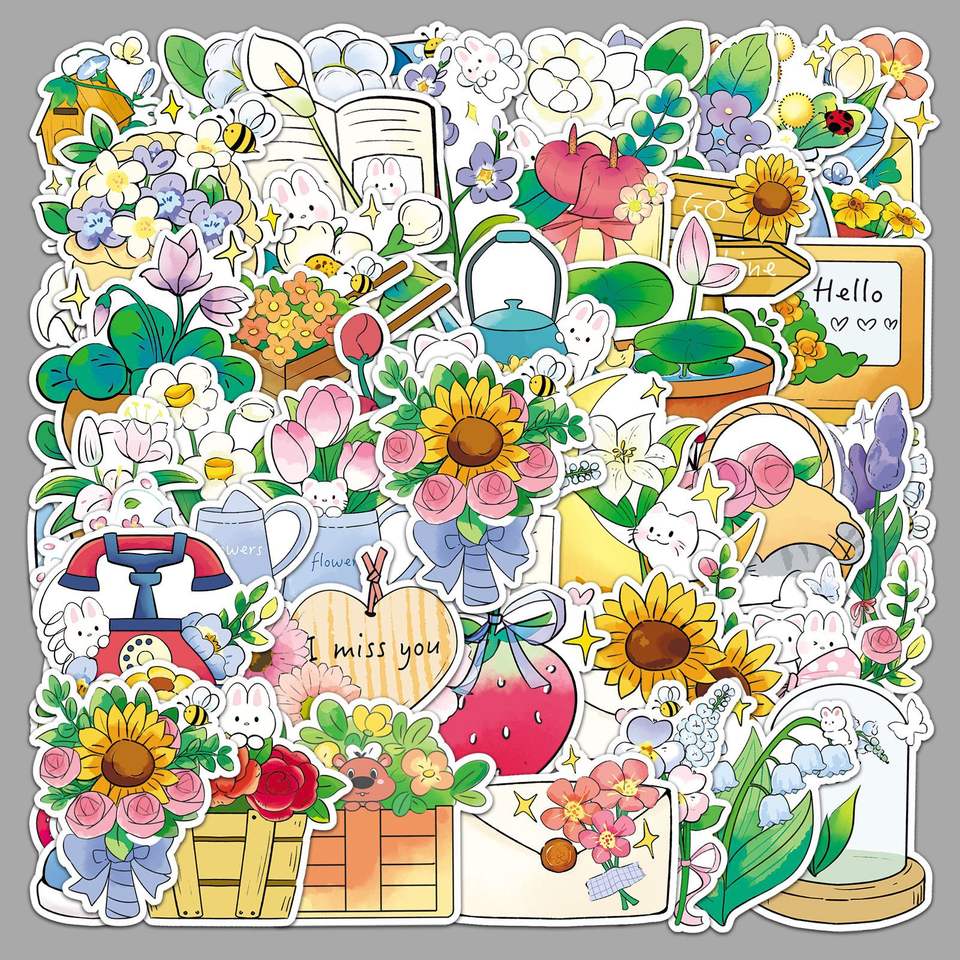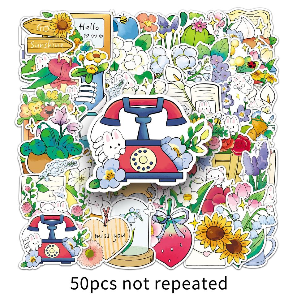 50 autocollants floraux, décorations simples en PVC découpées pour téléphones portables et agendas, étiquettes créatives pour emballages