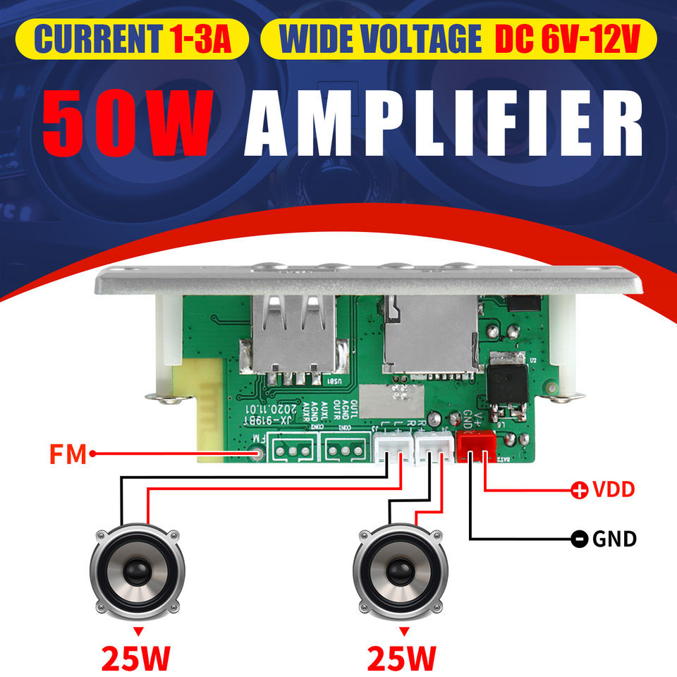 Amplificateur de lecteur MP3 de voiture 50W 12V Bluetooth 5.0 25W Carte de décodeur MP3 Module d'enregistrement USB Radio FM AUX Haut-parleur mains libres Musique