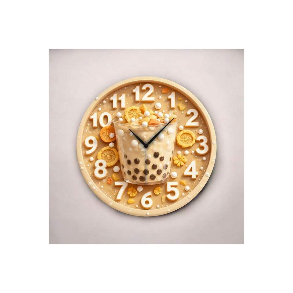 Horloge murale silencieuse en bois de 50cm avec design de thé à bulles en relief Article cadeau à motifs imprimés en couleur