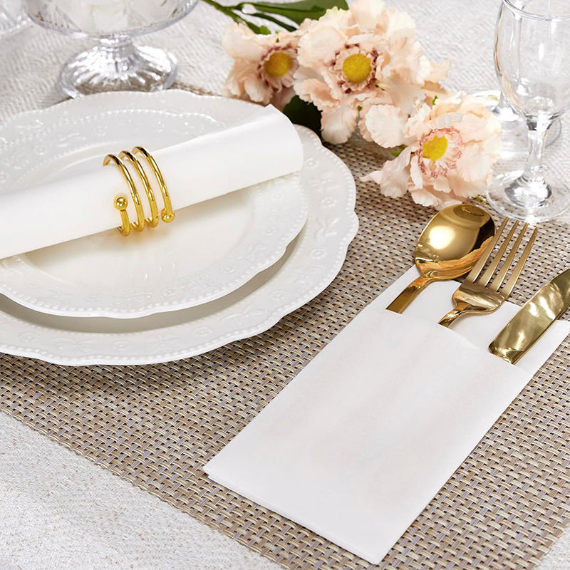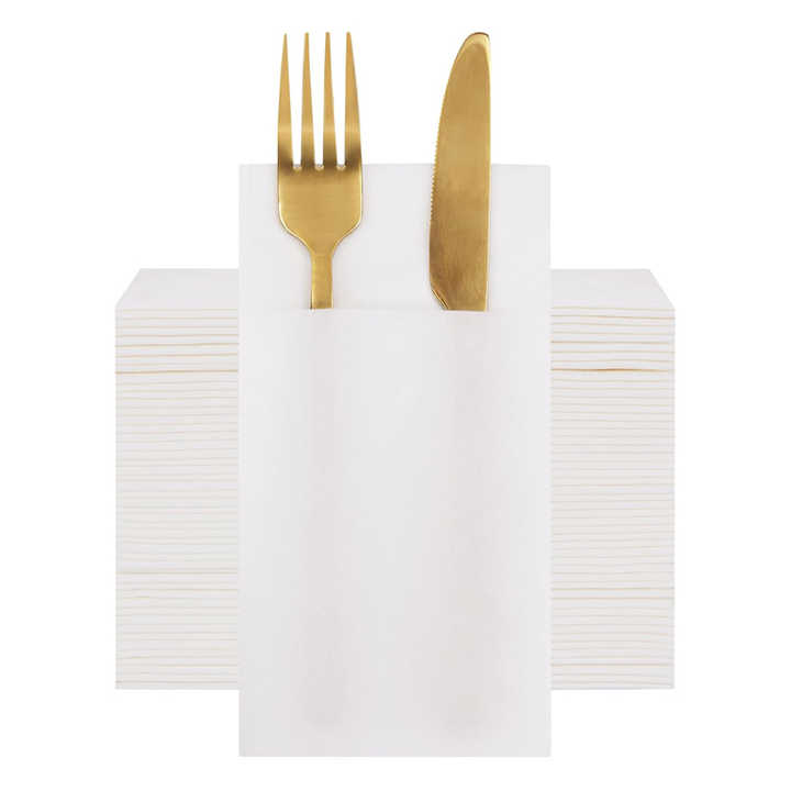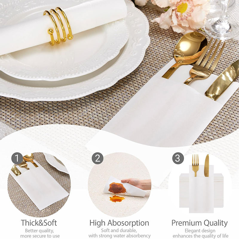 50 serviettes en papier blanc pré-pliées effet lin, serviettes jetables aspect tissu avec poche intégrée pour couverts, pour fêtes ou événements
