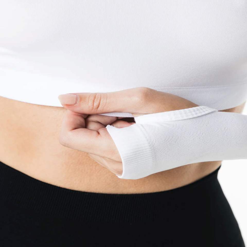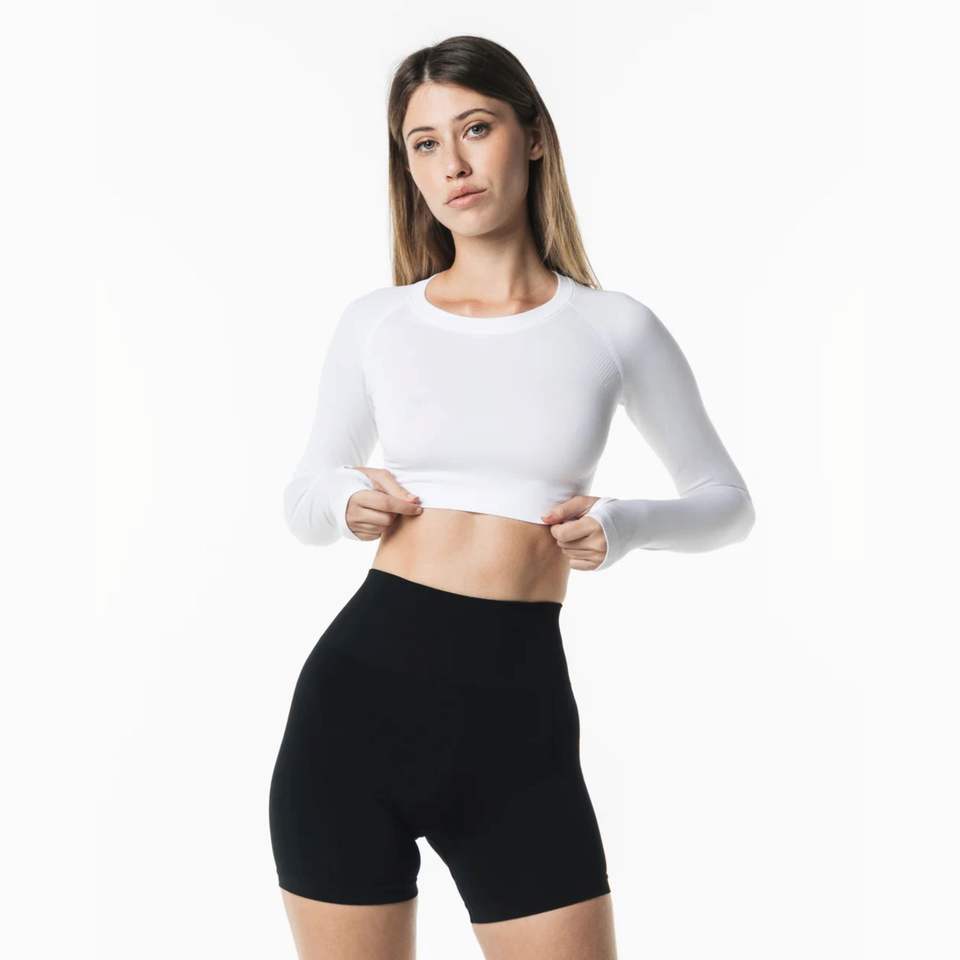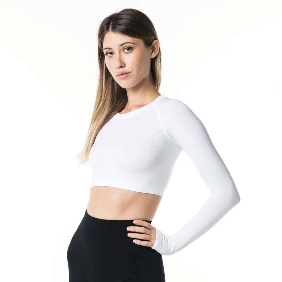 Chemise à manches longues sans couture pour femme, 51% Polyamide, 38% Polyester, 11% élasthanne, encolure ras du cou, taille Raglan, blanche