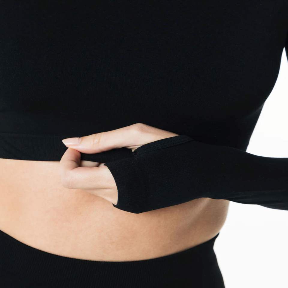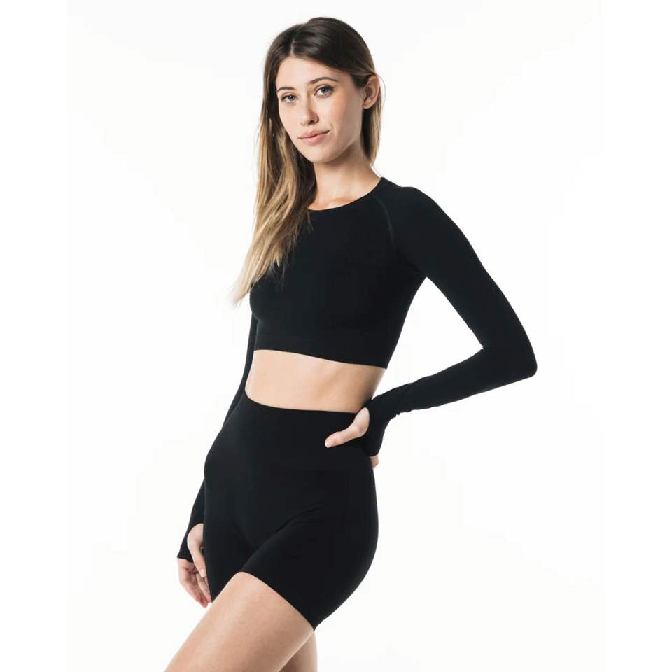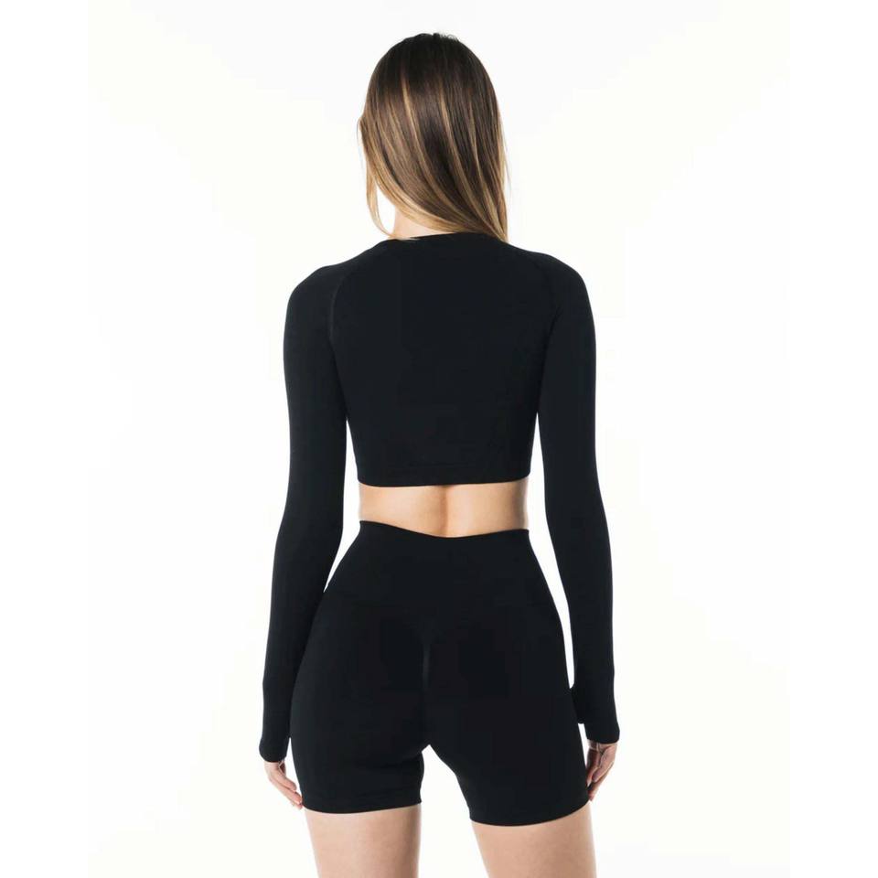 Chemise à manches longues sans couture pour femme, 51% Polyamide, 38% Polyester, 11% élasthanne, encolure ras du cou, taille Raglan, noir