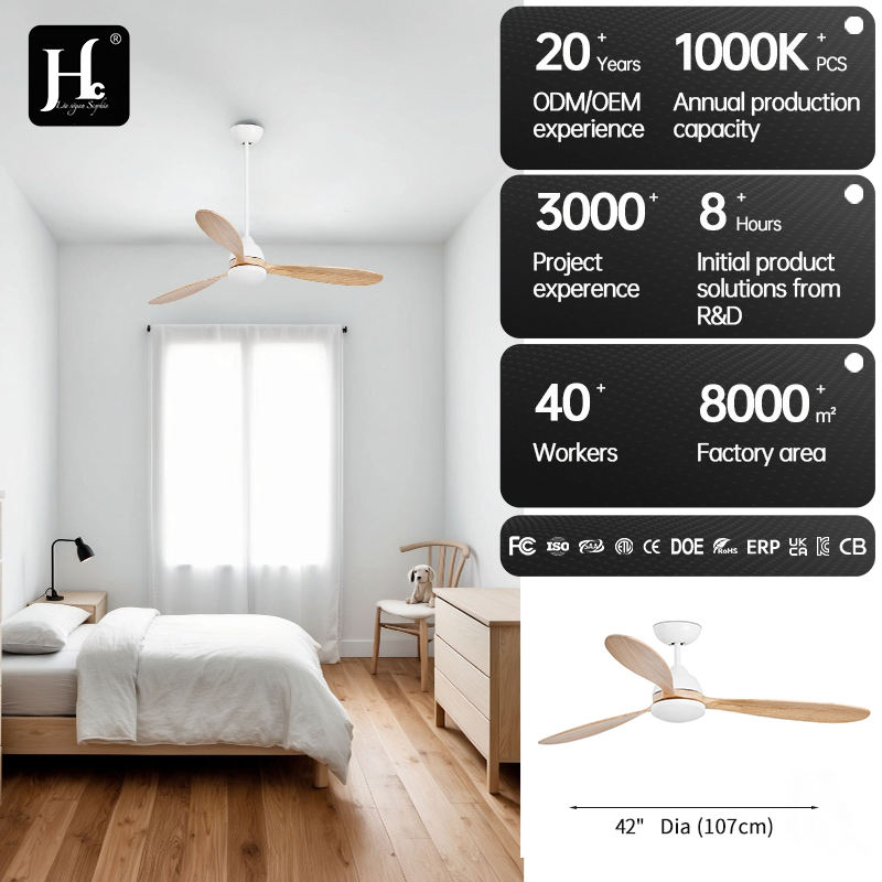 Ventilateur de plafond LED à télécommande à 5 vitesses en bois massif avec moteur électrique CC de 52 pouces pour usage domestique