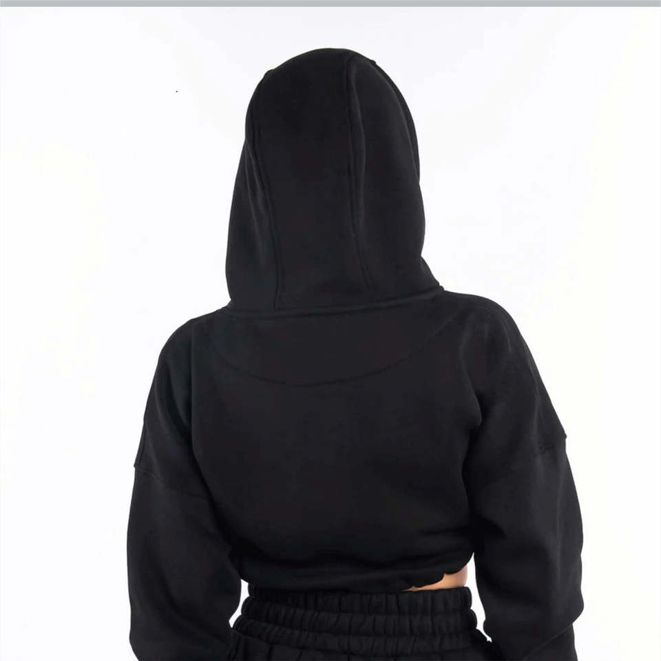 Sweat à capuche court à fermeture éclair intégrale, style épaules tombantes, coupe ample, noir, classique, pour femmes, 55% coton, 45% élasthanne