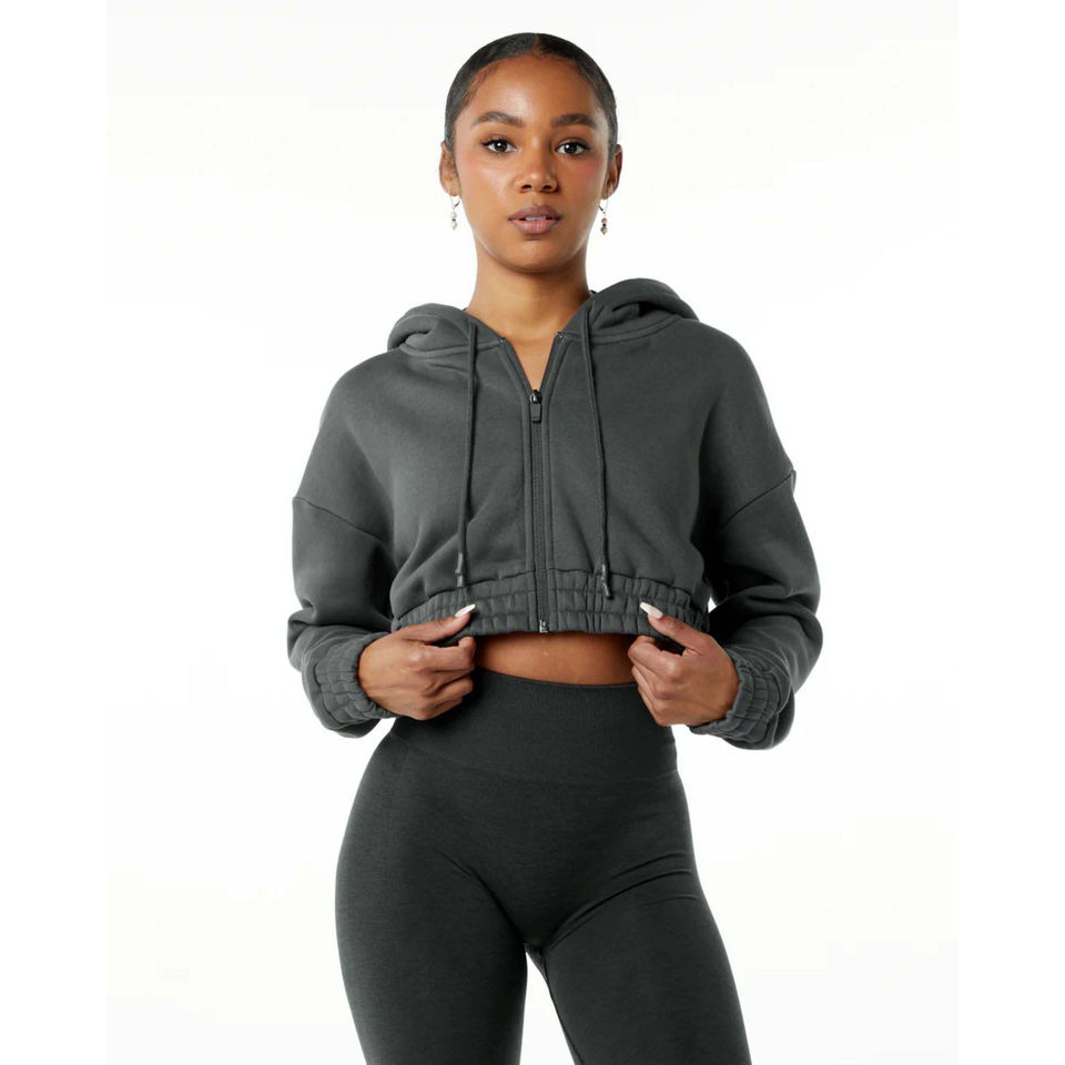 55% coton, 45% Spandex goutte épaule Style surdimensionné coupe courte fumée femmes classique Capital Full-Zip Crop Hoodie