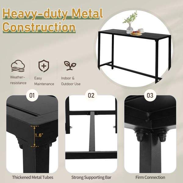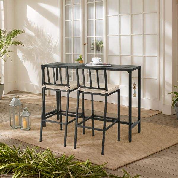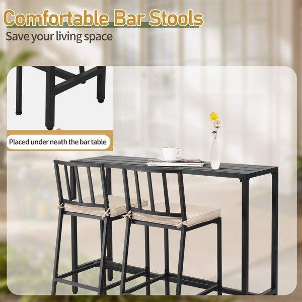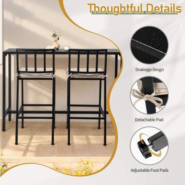 Table de bar rectangulaire haute de 55 po et 2 tabourets de bar rembourrés, ensemble de bar d'extérieur en métal, 3 pièces, C