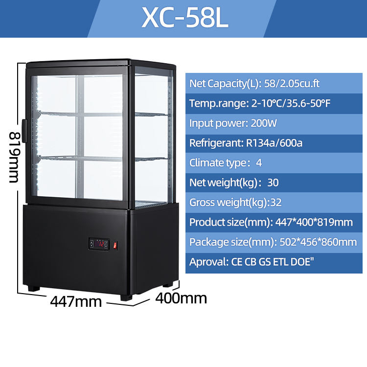 Réfrigérateur vertical à 4 portes latérales en verre de 58 litres, affichage commercial d'hôtel, vitrine de refroidissement, réfrigérateur pour boissons non alcoolisées