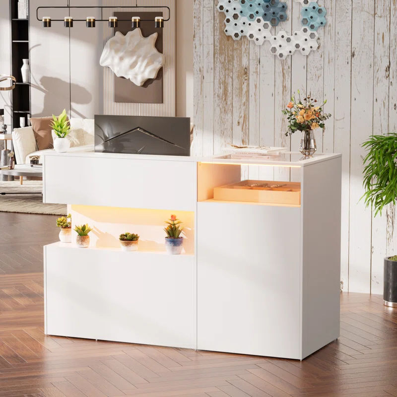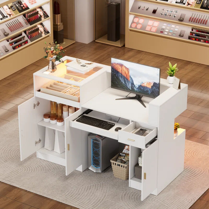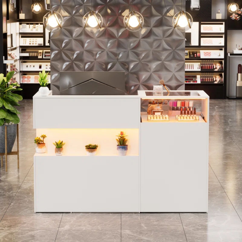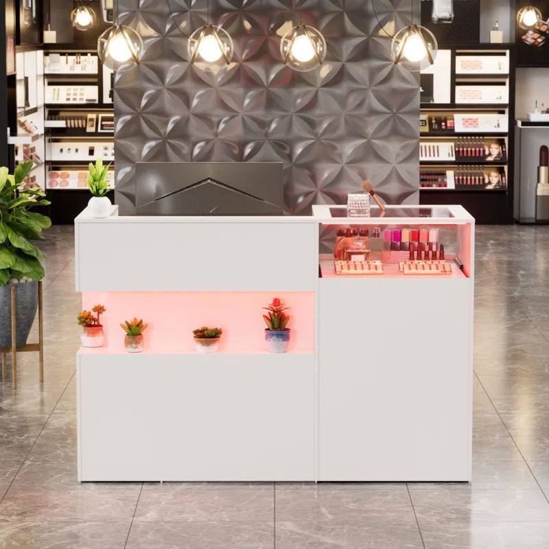 Comptoir de réception moderne de 59 pouces avec éclairage LED et étagère en verre, élégant comptoir de caisse pour le commerce de détail avec étagères de présentation